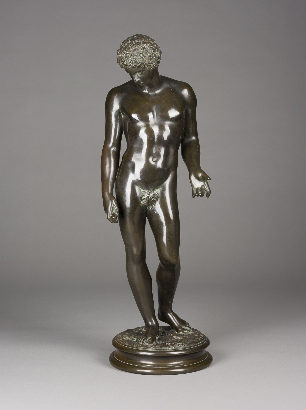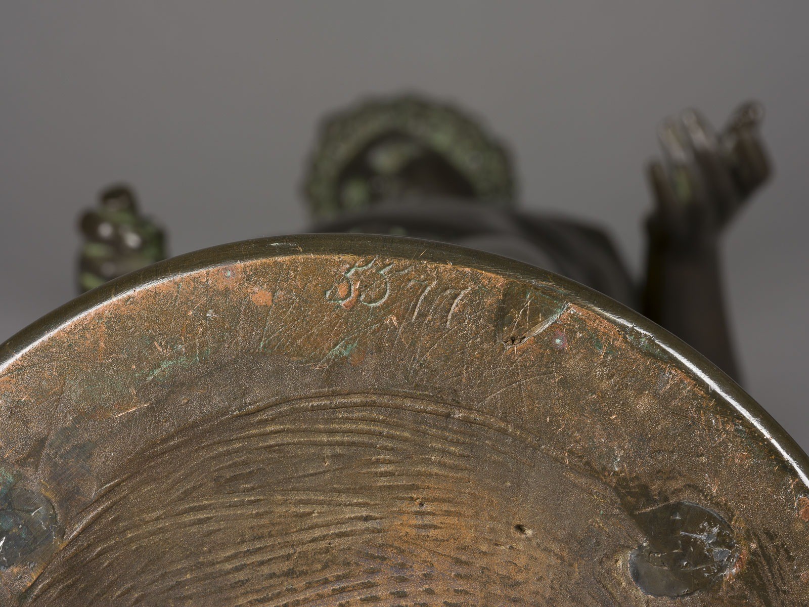 Galvanoplastik, dunkel patiniert, auf rundem Sockel (H. 5,5 cm). Ges.-H. 65, B. 22, T. 20 cm, Gew. ca. 8,15kg. Rückseitig an der Plinthe bezeichnet 'C. Kopp, G. Hillmann, 1897'. Part. Verlust der Patina und best.