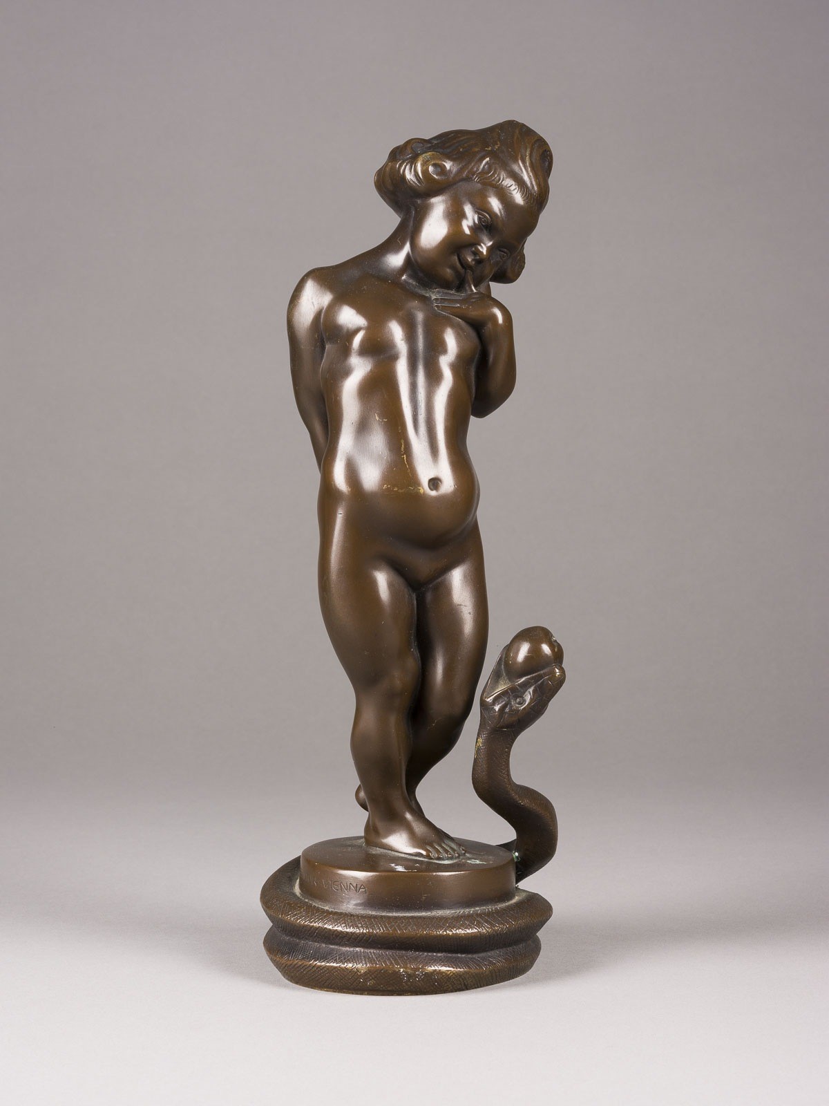Bronze, braun patiniert, auf runder Plinthe. Ges.-H. 36, B. 13,5, T. 13 cm, Gew. ca. 5kg. Auf der Plinthe signiert 'Joseph Josephu', seitlich 'Argentor Vienna'. Symbolistische Darstellung der Eva als jugendliches Mädchen. Die Schlange windet sich um