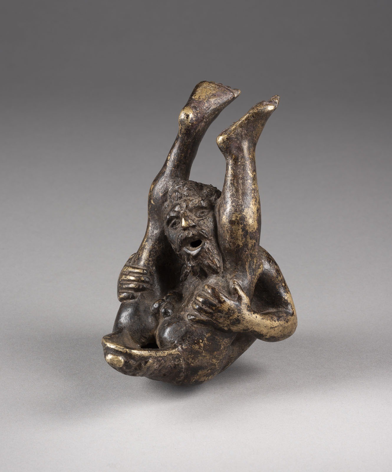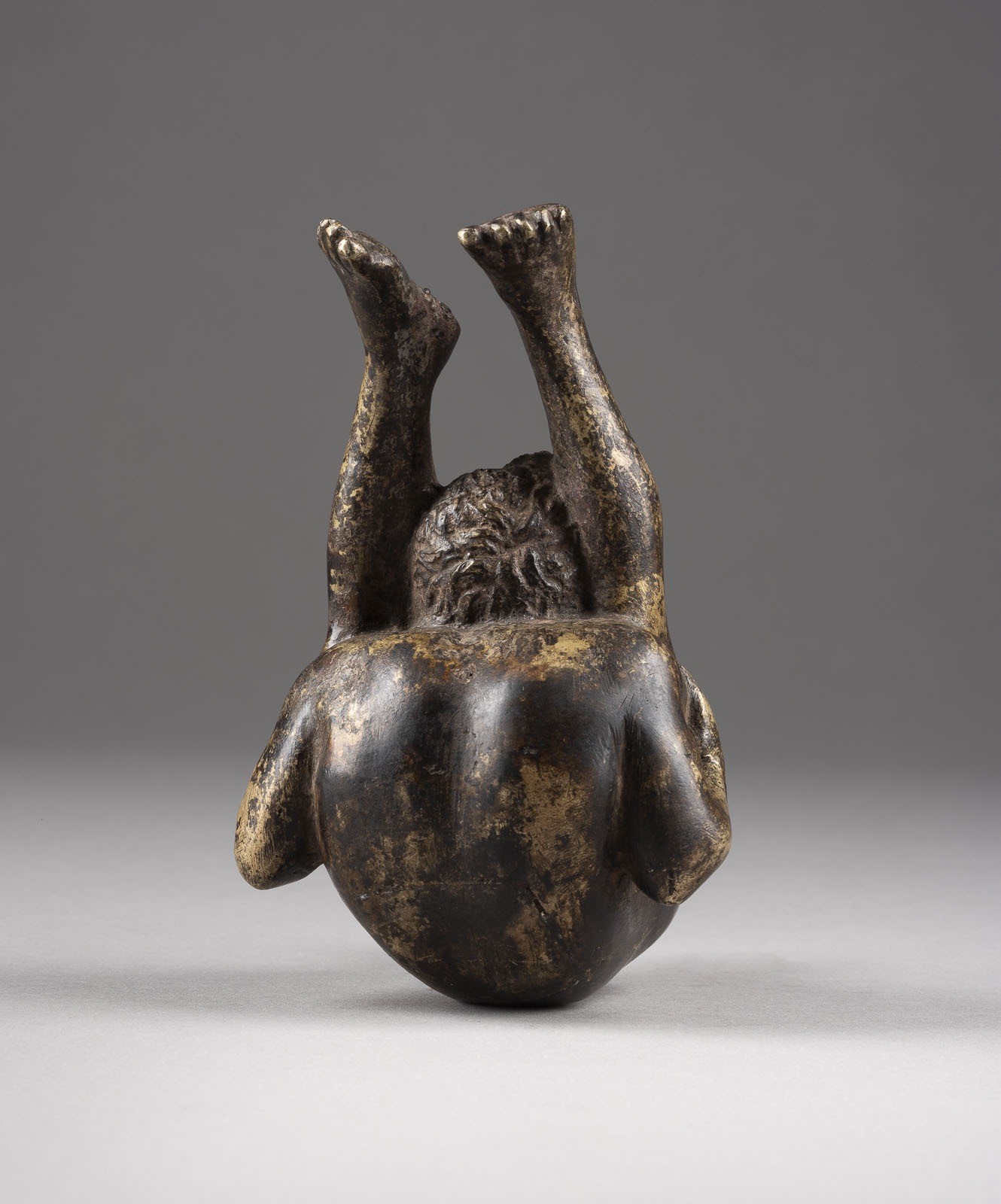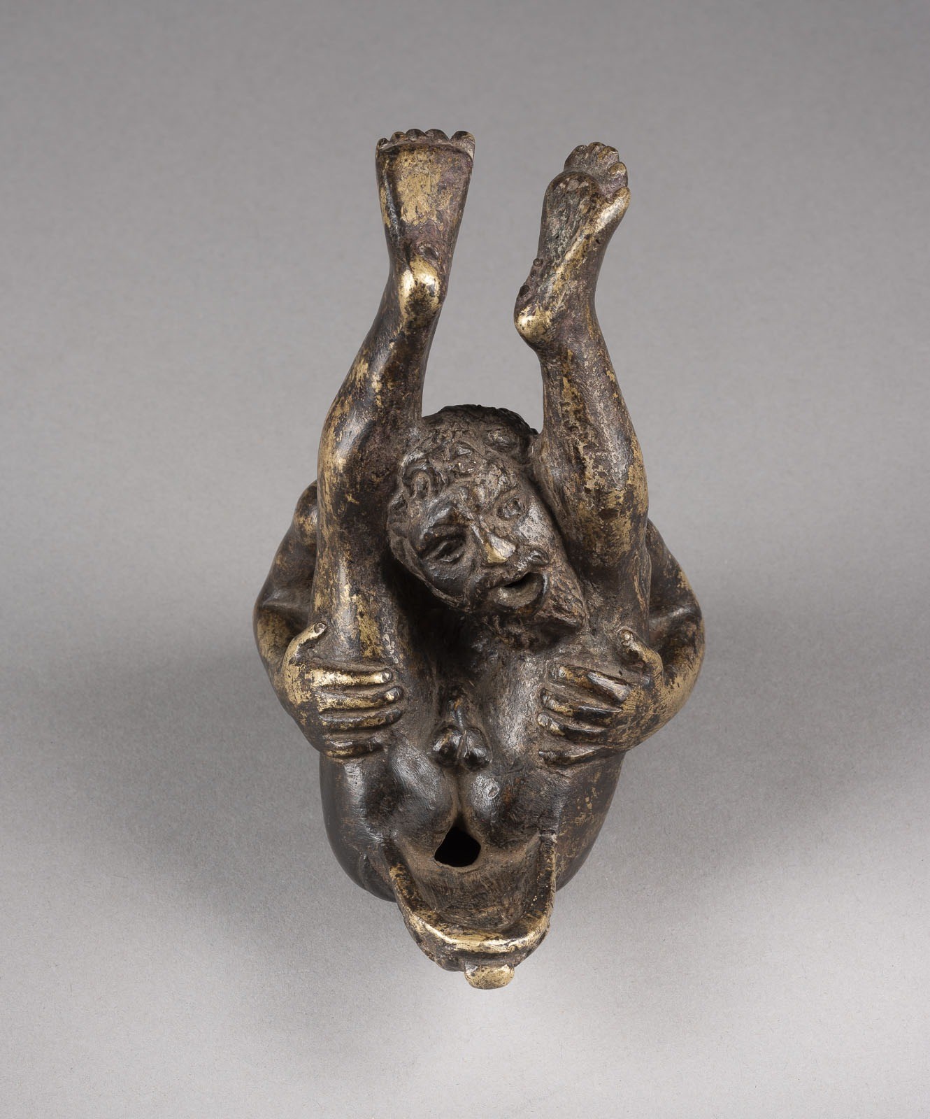 Bronze, dunkel natürlich patiniert, an den Füßen Wachsausschmelzpunkte. H. 14, B. 9,5, T. 11,5 cm, Gew. ca. 0,75kg. Ungewöhnliche figürliche Öllampe aus dem Kreis der sogenannten "Akrobaten", einer der