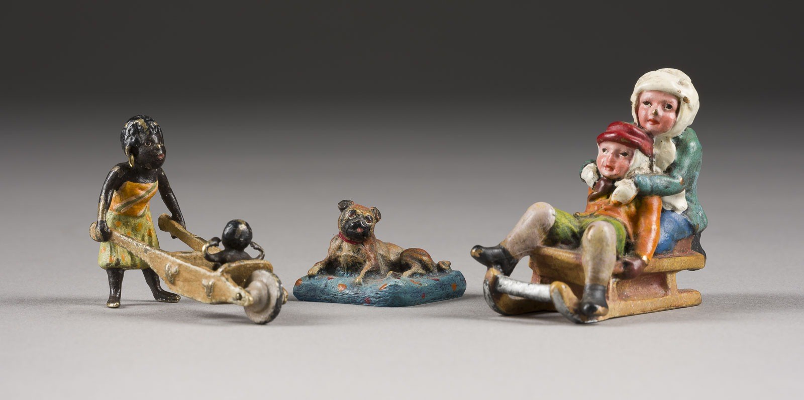 Wiener Bronze, polychrom gefasst. H. 5/4/2,5 cm. Schlittenfahrer an der Unterseite bez. 'Berrmann Wien', Mops gemarkt. Part. Fassungsverluste.