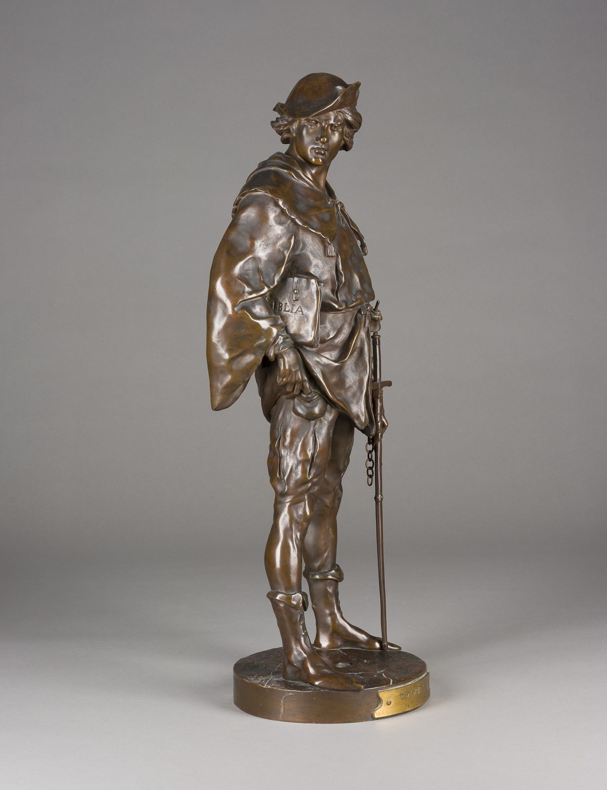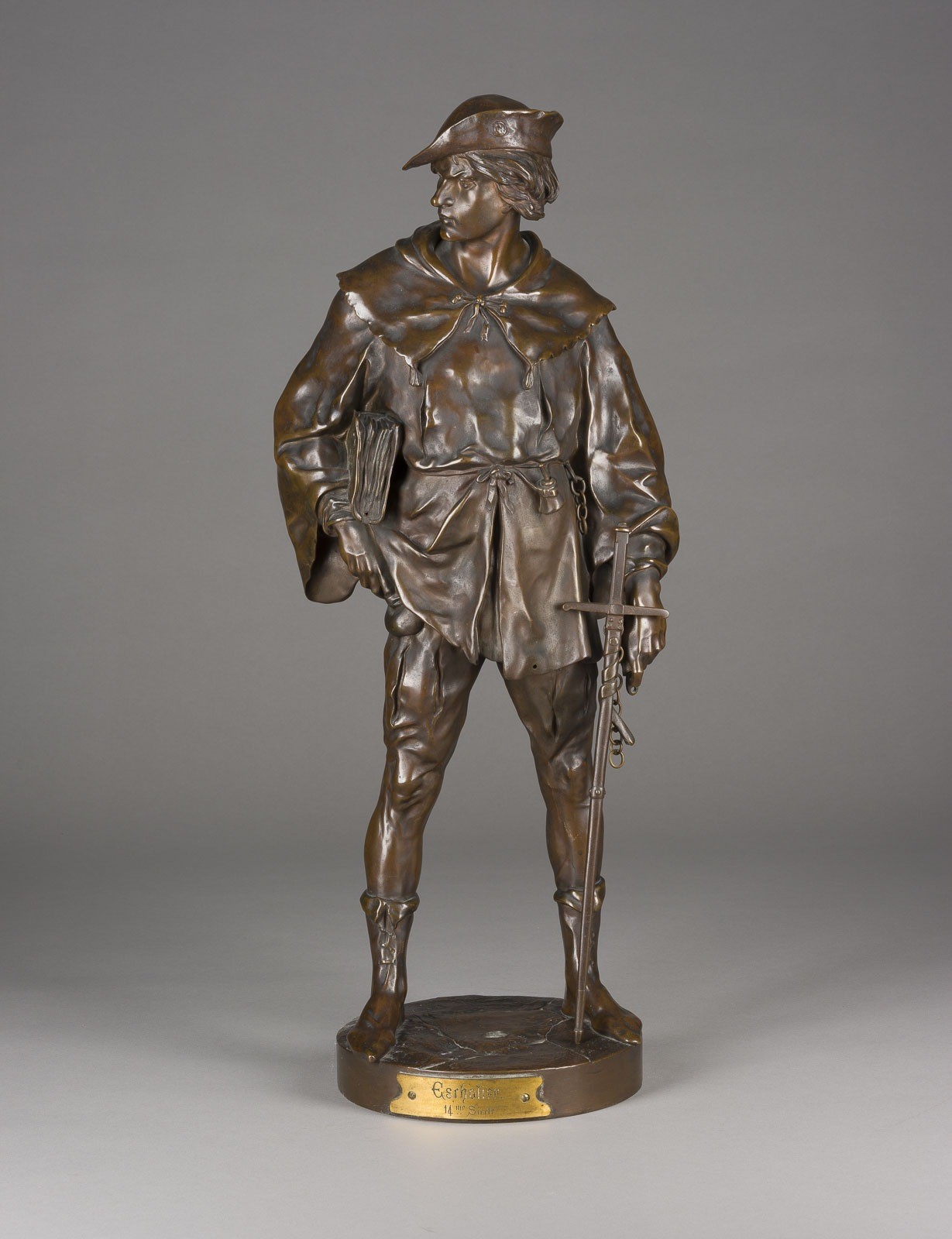 Bronze, dunkel patiniert, auf runder Plinthe (H. 3,5 cm). Ges.-H. 64, B. 28, T. 21 cm, Gew. ca. 12,68 kg. Auf der Plinthe bez. 'E. Picault', vorderseitig Plakette 'Escholier 14eme Siècle'. Vollplastische Darstellung eines jungen Gelehrten (Escholier), der das Buch Biblia unter