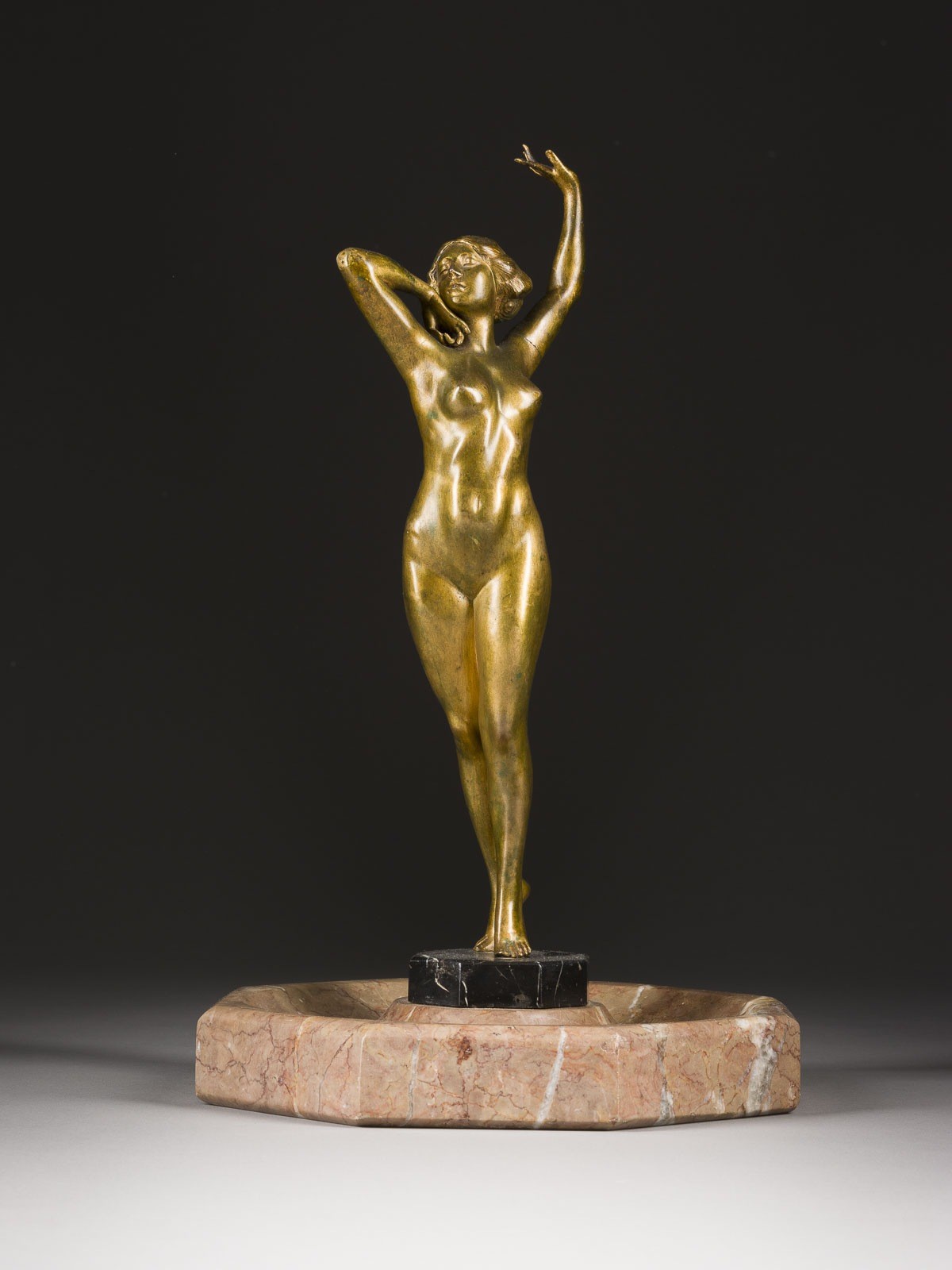 Bronze, golden patiniert, montiert auf einer Marmorschale. Ges.-H. 40,5, B. 24, T. 23,5 cm, Gew. ca. 5,6kg. Auf der Plinthe signiert 'P. Philippe'. Part. Verlust der Patina, Arme angesetzt.