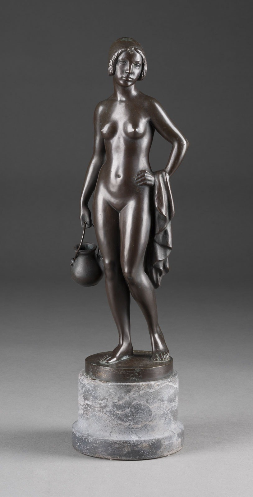 Bronze, schwarz patiniert, auf runder Plinthe und Marmorsockel. Ges.-H. 43,5, D. 11 cm, Figur 34 cm, Gew. ca. 5 kg. Rücks. auf der Plinthe sig. 'Haase-Ilsbg.. Kopf und Arme part. best., min. ber..