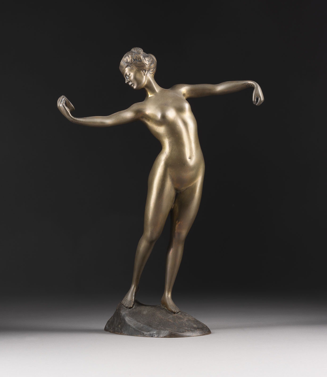 Bronze, dunkel und vergoldet patiniert, auf naturalistischer Plinthe. Ges.-H. 37, B. 25, T. 18 cm, Gew. ca. 3kg. Auf der Plinthe seitlich bezeichnet 'A. Löwental' und datiert '1910', Verso num. '250'. Elegante Darstellung eines weiblichen Aktes mit Trinkschale, in ruhiger und graziler