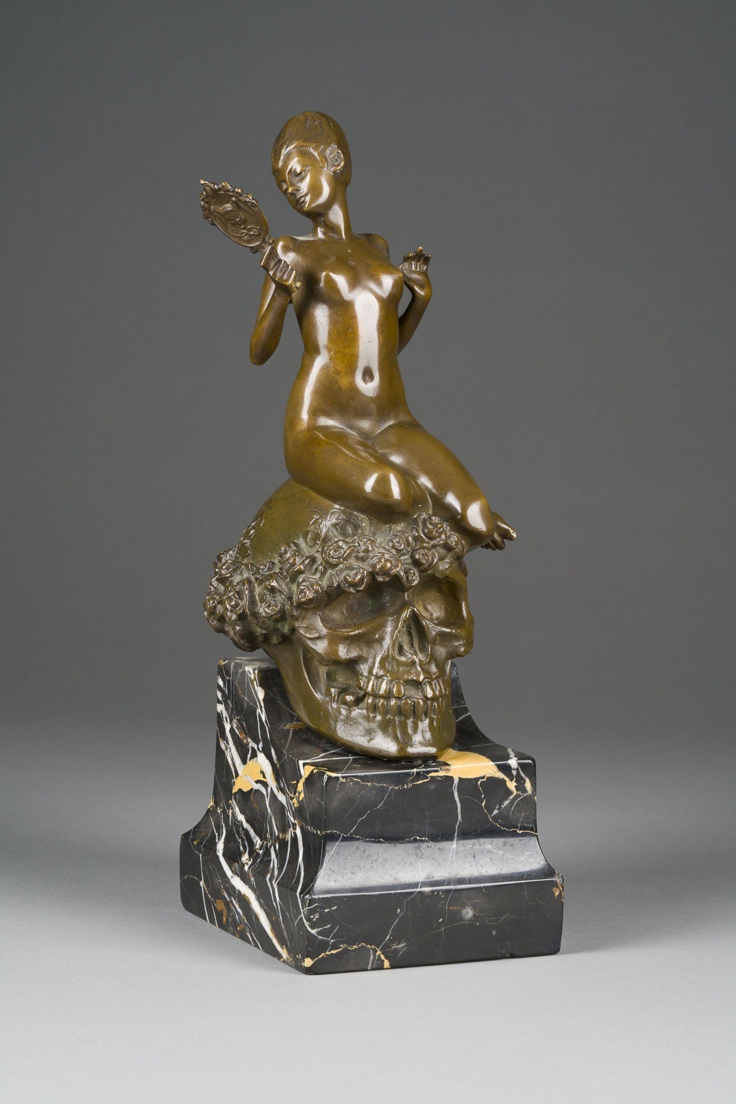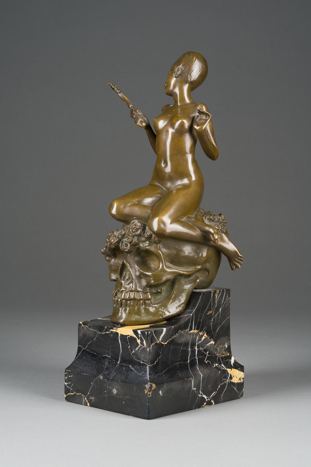 Bronze, braun patiniert, Marmorsockel (H. 8 cm. Ges.- H. 32, B. 10,5, T. 13 cm, Gew. ca. 4,53. Seitlich auf dem Totenkopf bezeichnet 'Elischer' und datiert '1921'. Symbolistische Darstellung eines weiblichen Aktes, der auf einem Totenkopf sitzt und einen
