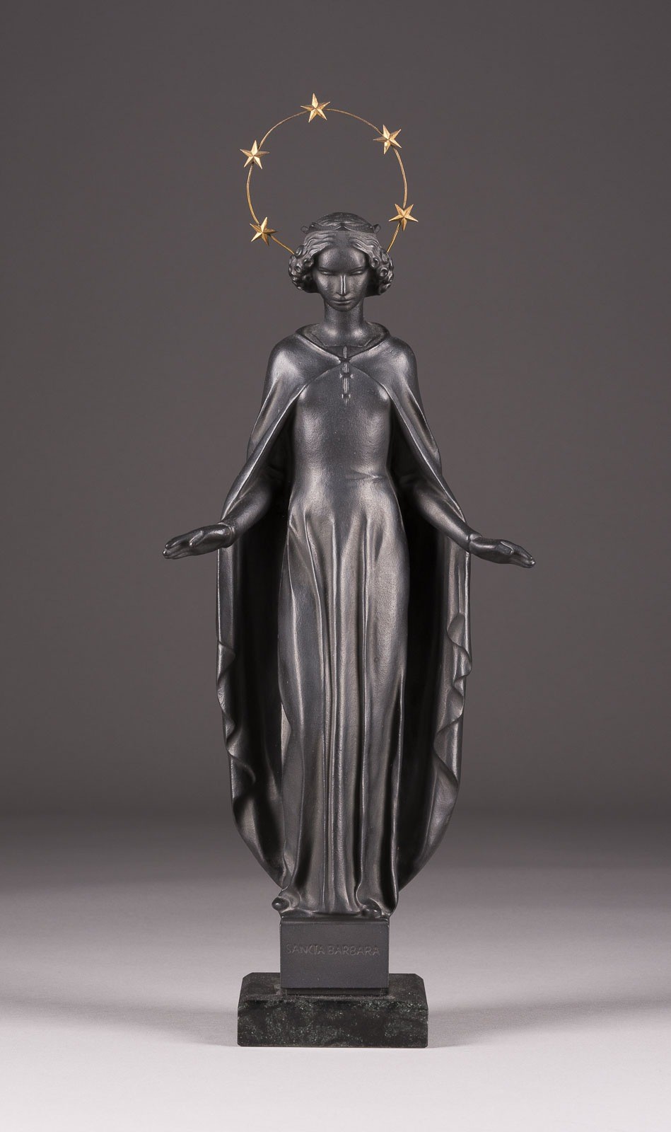 Eisenguss, geschwärzt, auf sechseckigem Sockel, vergoldeter Sternenreif, auf quadratischem Sockel (H. 2,5 cm). Ges.-H. 40,5, B. 17,5, T. 9,5 cm, Gew. ca. 4,69kg. Verso monogrammiert 'HM', Giessereimarke 'Lauchhammer', vorderseitig bez. Sancta Barbara'. Min. best.