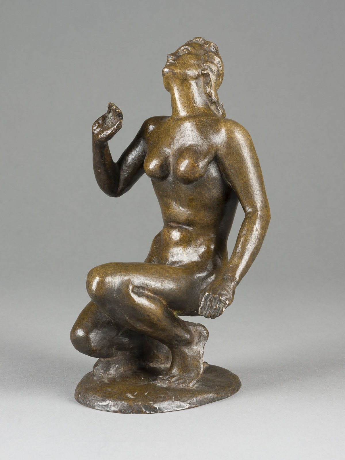 Bronze, braun patiniert, auf naturalistischer Plinthe. H. 23,5, B. 14, T. 13 cm, Gew. ca. 2,88 kg. Auf der Plinthe monogrammiert 'PO', vermutlich Paul Ohnsorge ( 1915-1975) oder Otto Pankok (1893-1966). Min. Verlust der Patina und best..