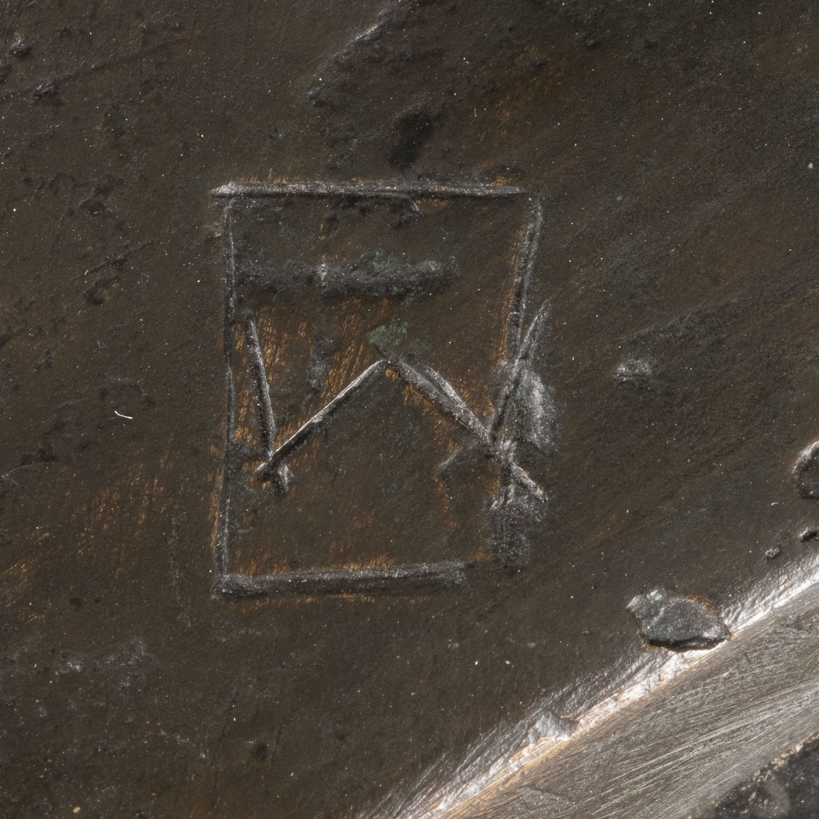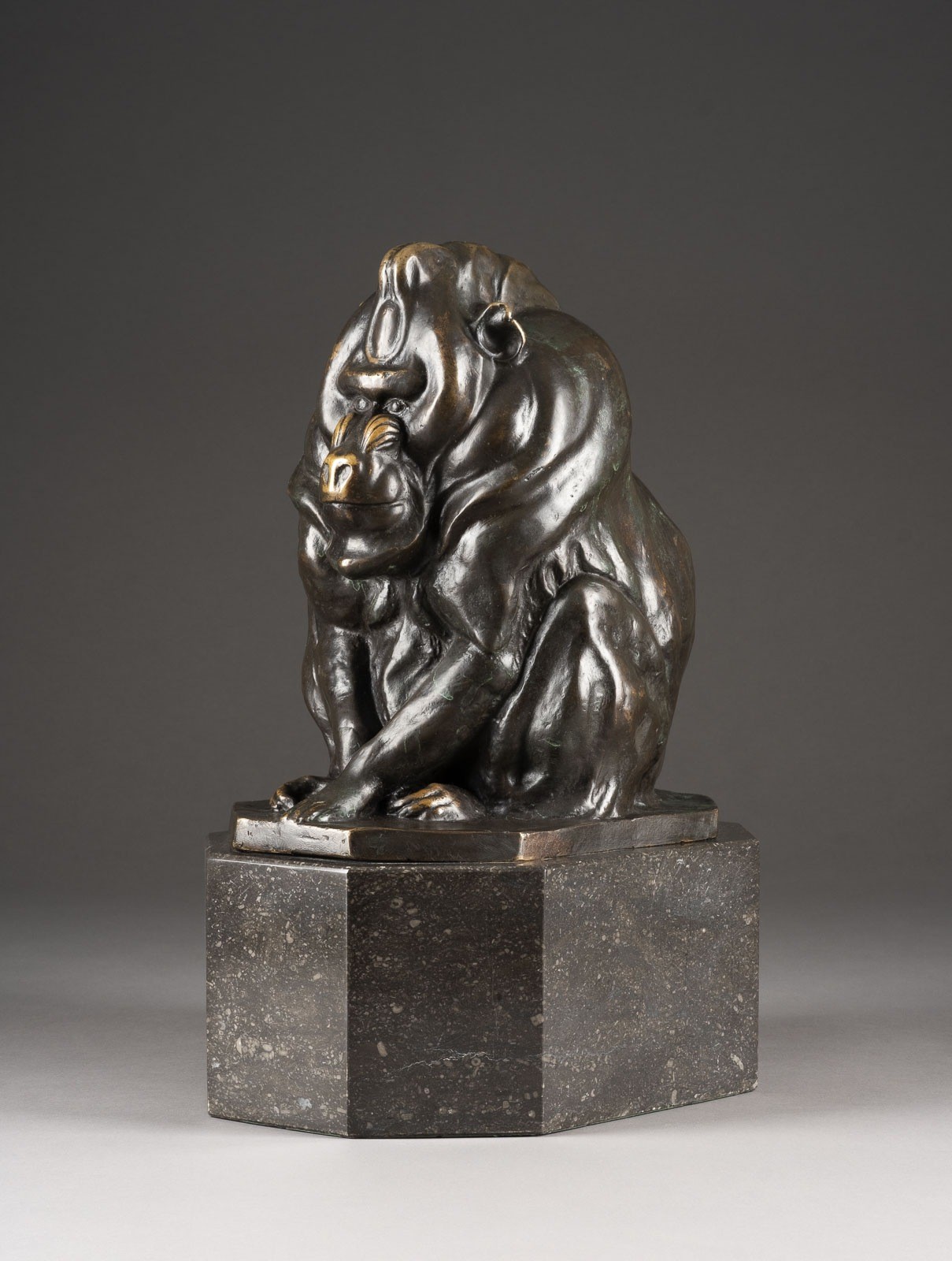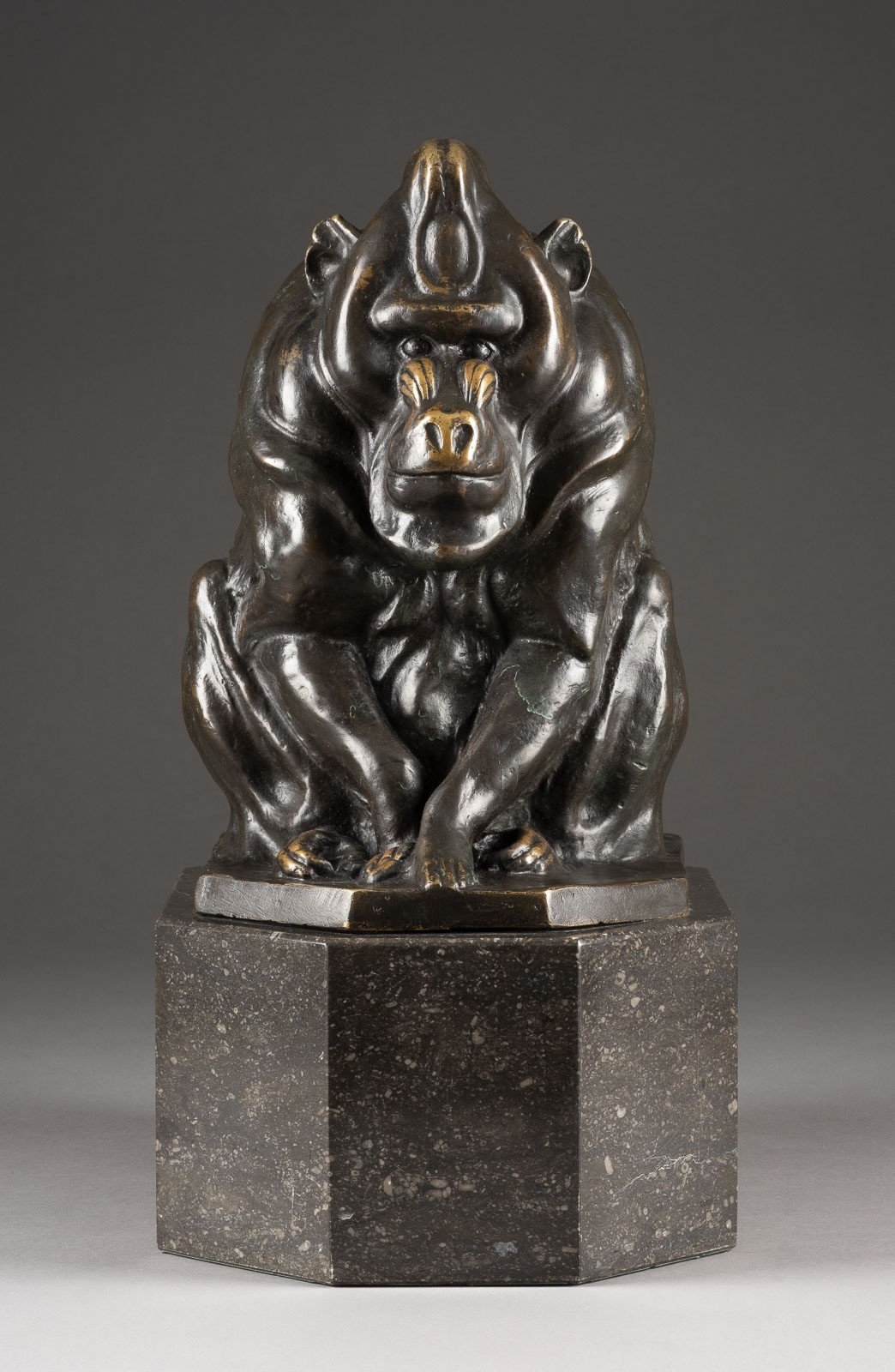 eines sitzenden Mandrillaffen. Verluste der Patina, teils mit Oxidationen.