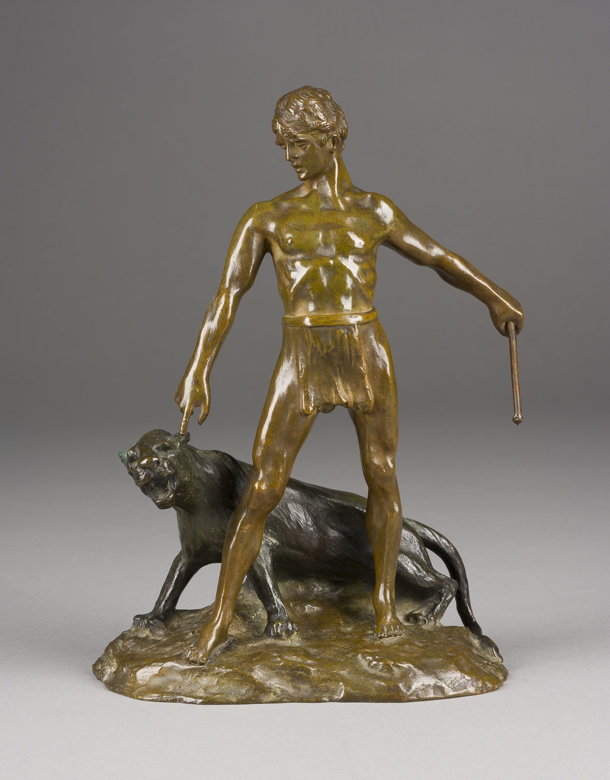 Bronze, braun patiniert, auf naturalistische Plinthe. H. 24, B. 16, T. 11 cm, Gew. ca. 2,23kg. Seitlich bezeichnet 'Pinedo', rückseitig gemarkt 'Bronze Garanti Au Titre Paris'. Darstellung eines stehenden Jünglings, wohl Dionysos, zu seinen Füßen schmiegt sich ein