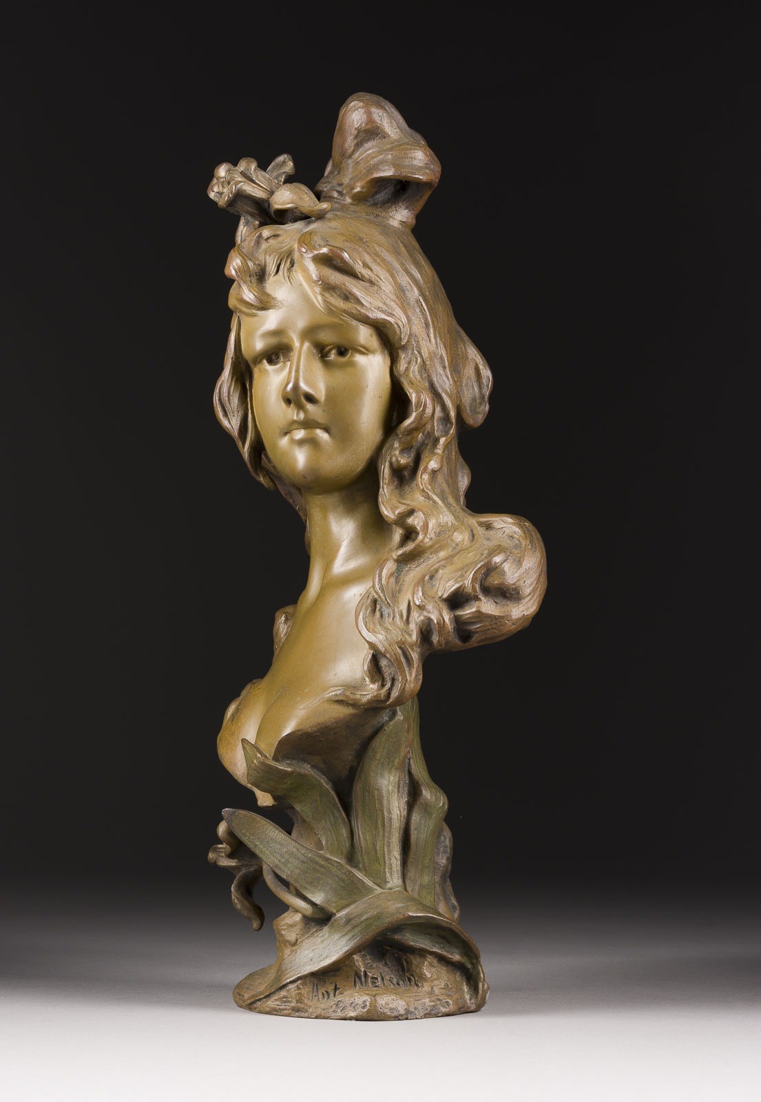 Bronze, braun patiniert. H. 42, B. 21, T. 15 cm, Gew. ca. 7,73kg. Seitlich bez. 'Alp. Nelson'. Part. Verlust der Patina, min. best.