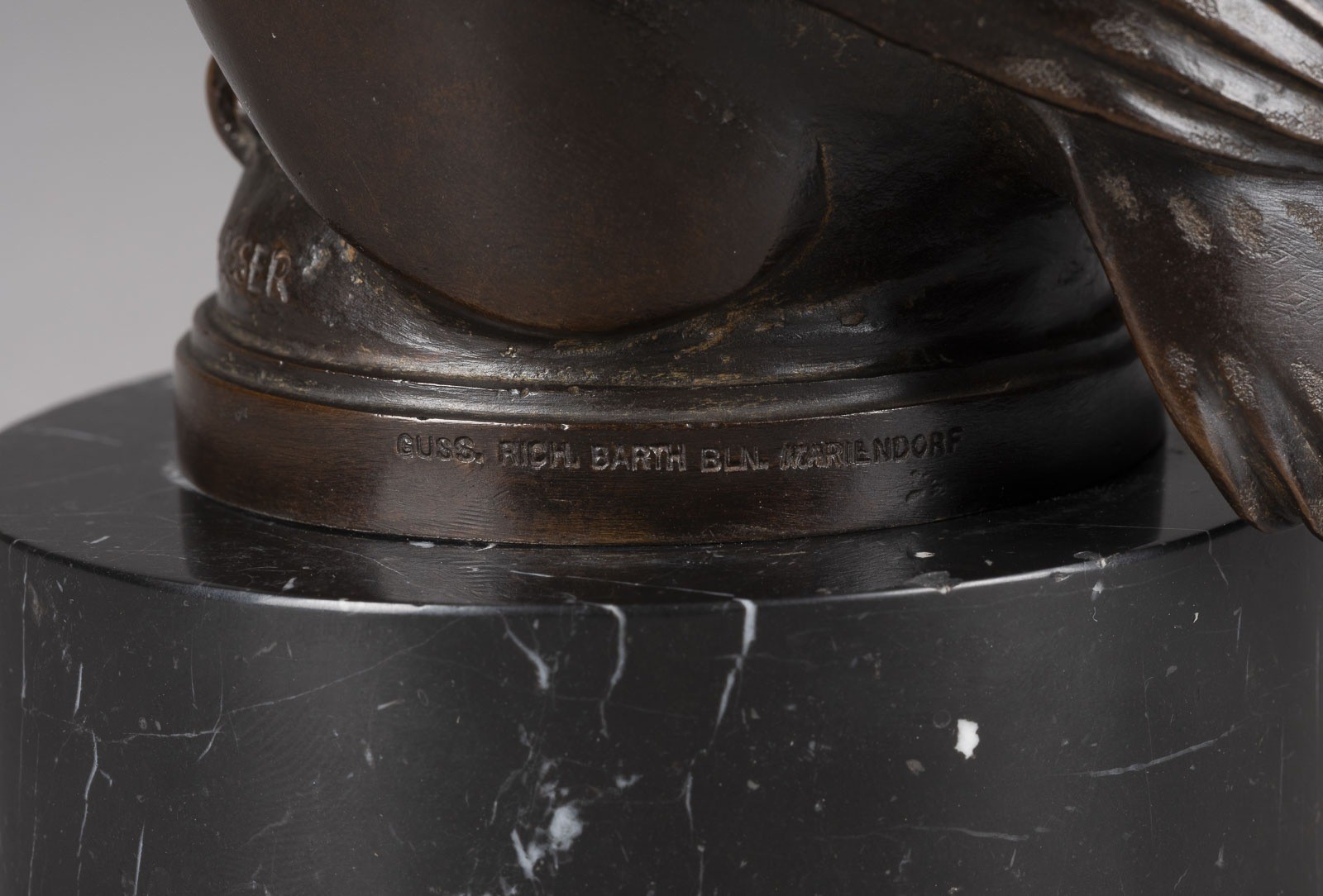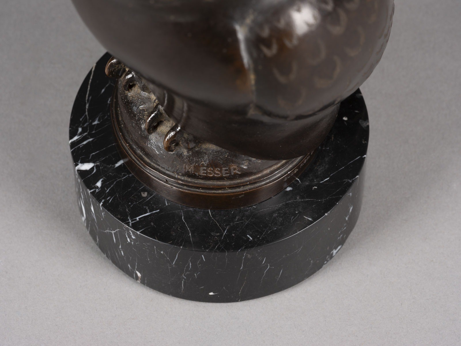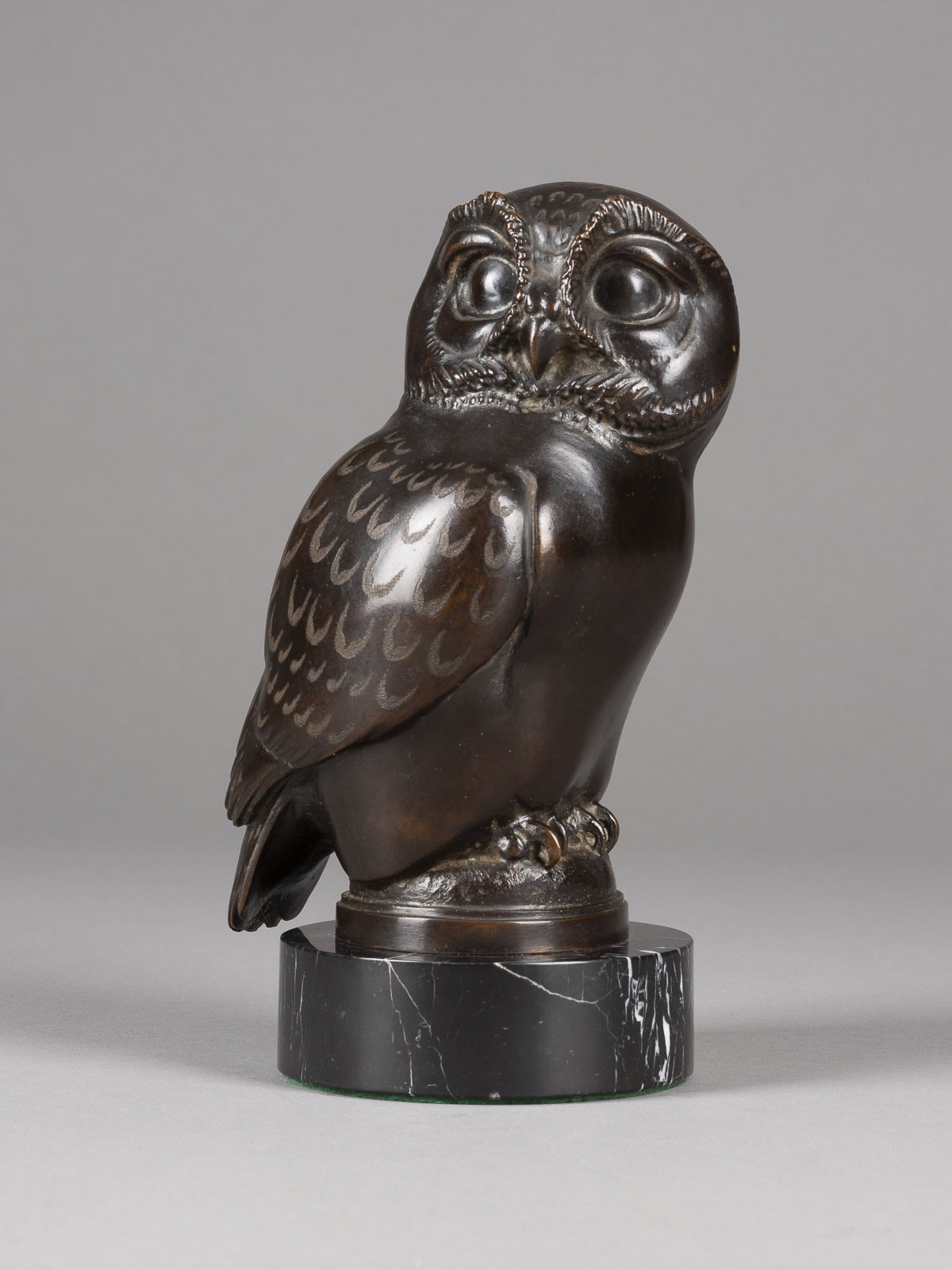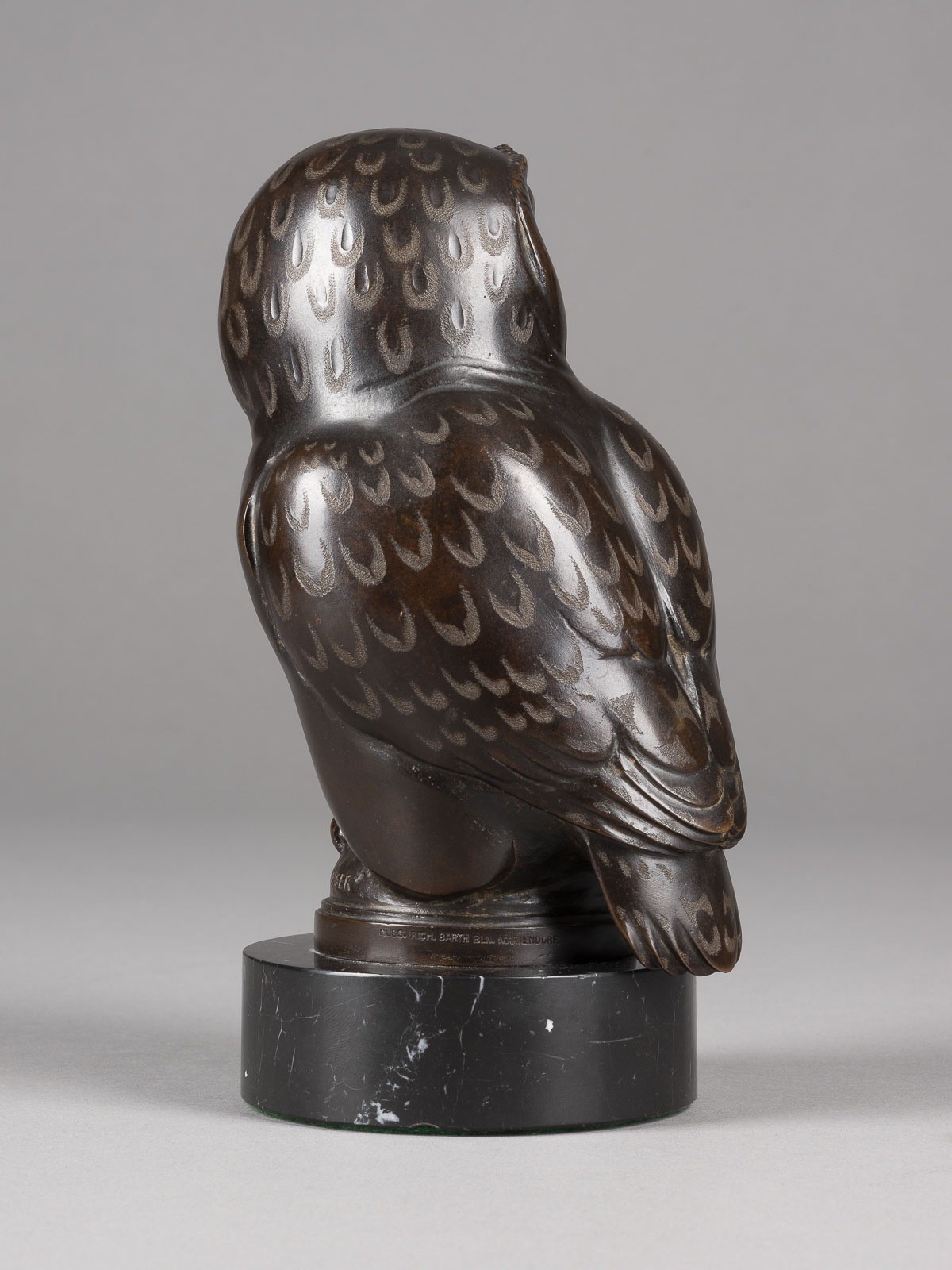 Bronze, dunkel patiniert, ziseliertes Federkleid, auf runder Plinthe und Marmorsockel (H. 3,5 cm). Ges.-H. 21, B. 10, T. 12 cm, Gew. ca. 1,78 kg. Rückseitig signiert 'M. Esser' und Giessereimarke 'Guss Rich. Barth, Bln Mariendorf'. Sehr seltene Ausführung eines der bekannten Käuzchen-Motive von Max Esser, hier in einer