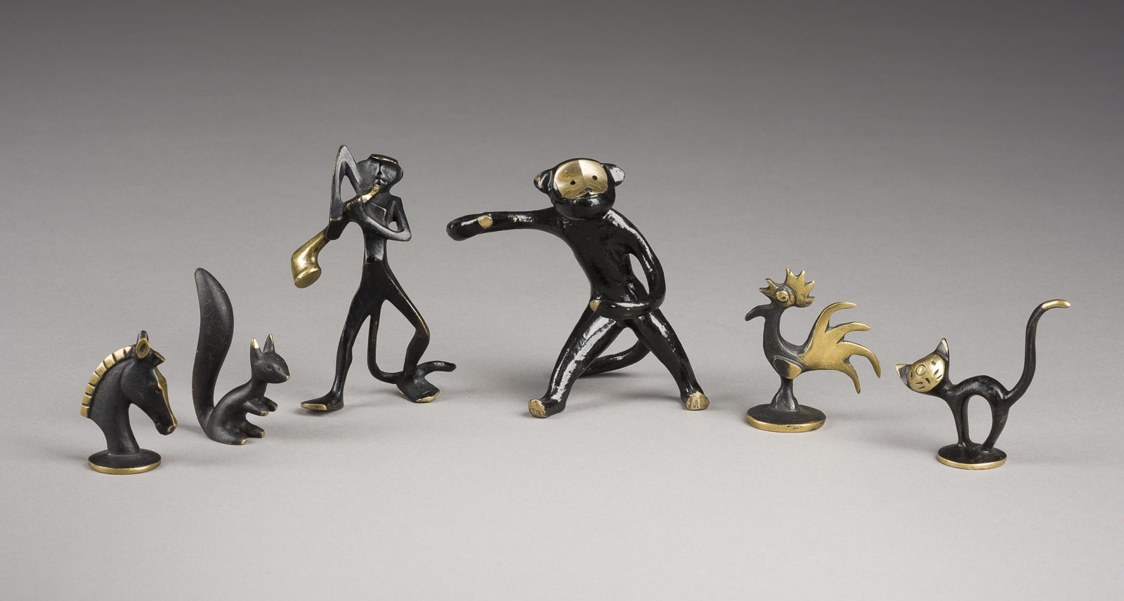 Bronze, dunkel patiniert und vergoldet. H. von 4 bis 9 cm. Teilweise an der Unterseite gemarkt 'Baller Austria'. Part. Verlust der Patina, ber.