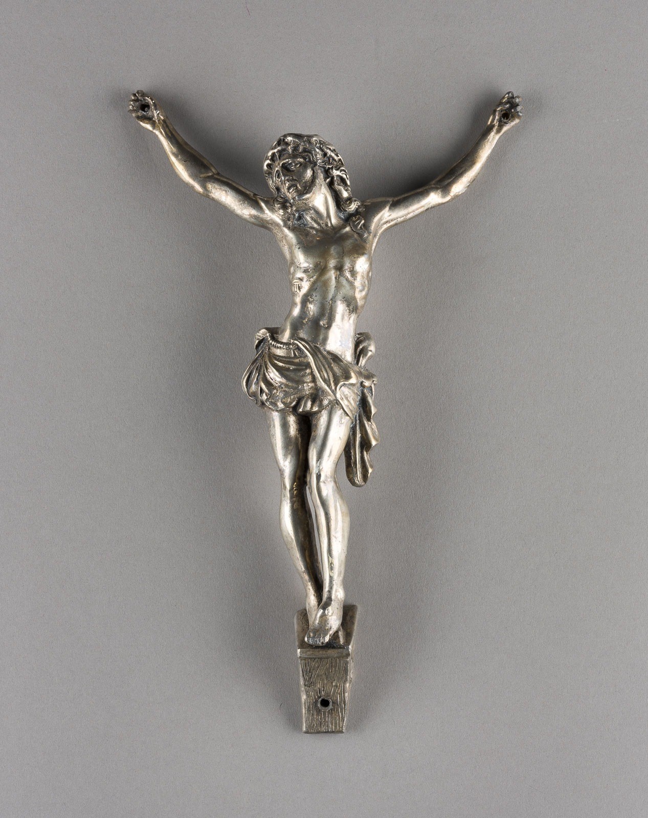 Bronze, versilbert, Hohlguss, Nagelungsstellen, rückseitig Oberkörper gehöhlt. H. 26, B. 16, T. 5 cm, Gew. ca. 1kg. Rückseitig am Oberschenkel nummeriert '5'. Ausdrucksstarker Korpus Christi im Dreinageltypus mit weit ausgebreiteten Armen, in
