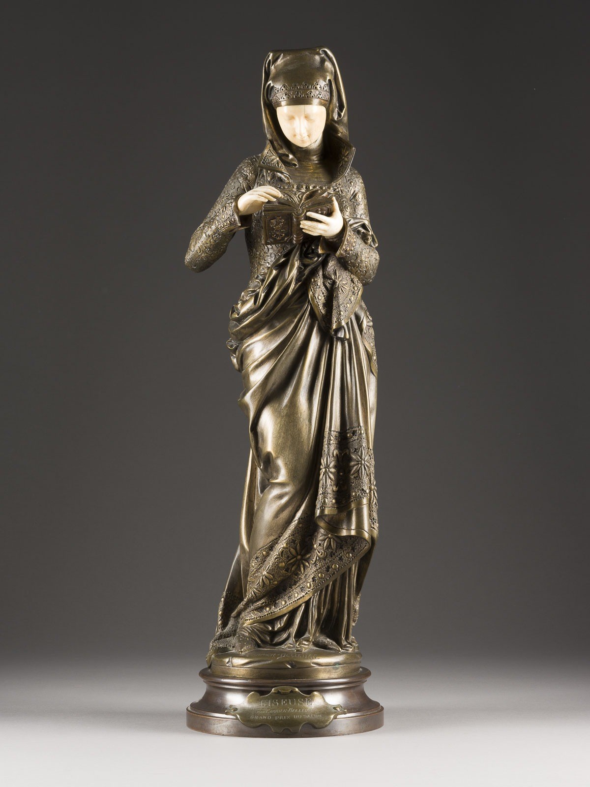 Chryselephantine, Bronze, dunkel patiniert, Gesicht und Hände aus Elfenbein geschnitzt, auf runder Plinthe. Ges.-H. 61,5, B. 18, T-. 18 cm, Gew. ca. 13,61kg. Vorderseitig auf der Plinthe sig. 'A. Carrier Belleuse', bez. Liseuse Par Carrier-Belleuse Grand Prix Du Salon'. Über einer runden Plinthe ganzfigurige Darstellung einer lesenden Frau in höfischer
