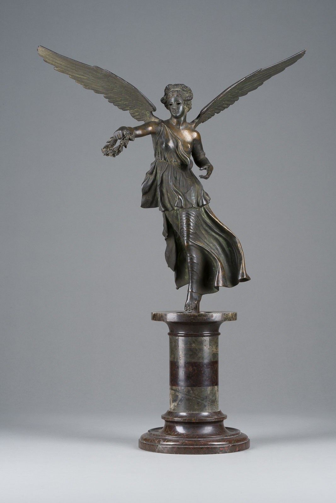 Bronze, dunkel patiniert, auf rundem Podestmarmorsockel (H. 24,5 cm). Ges.-H. 70,5, B. 48, T. 40 cm. Klassizistische Darstellung der Siegesgöttin Nike bzw. Viktoria mit ausgebreiteten Flügeln