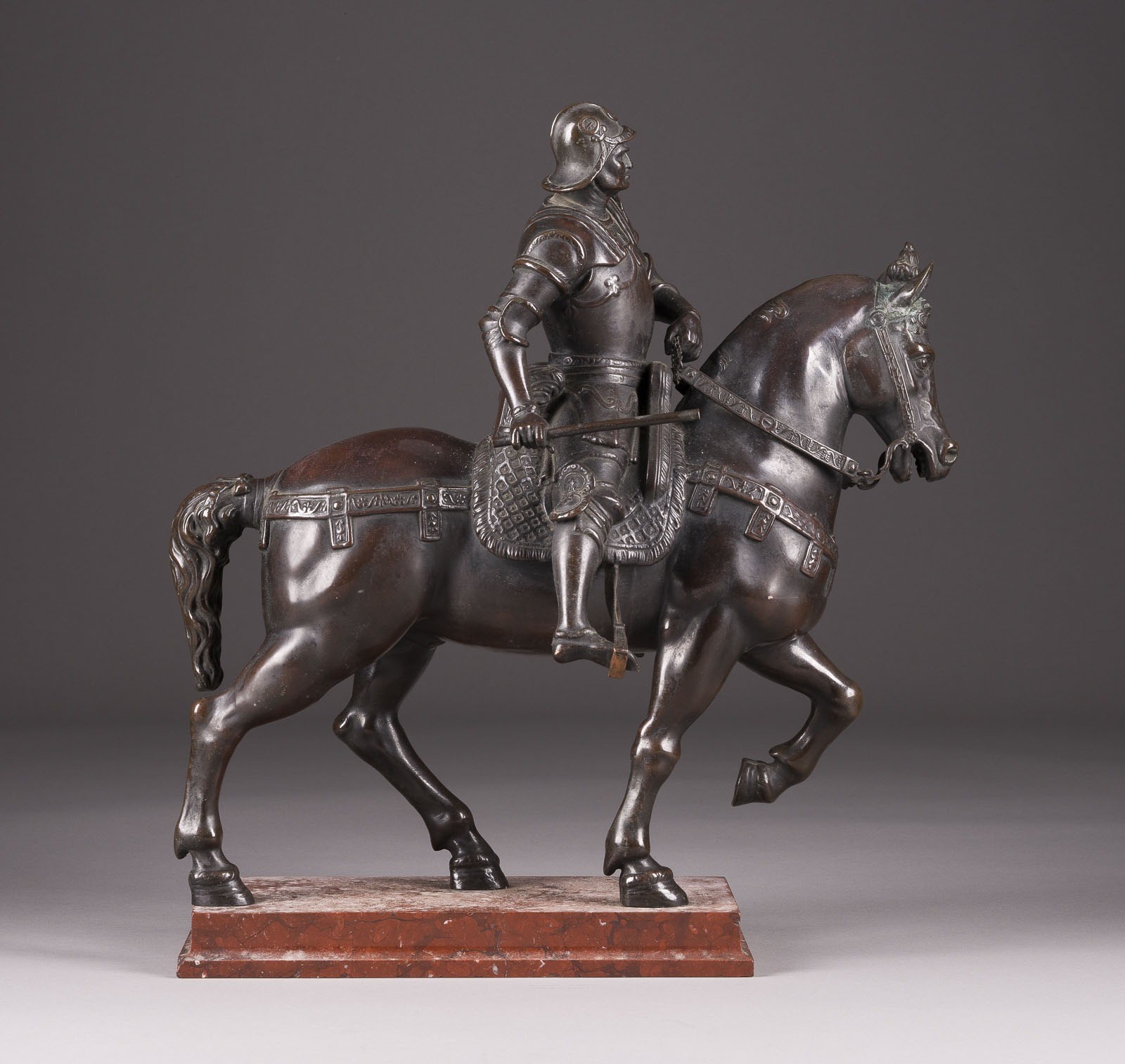 Bronze, dunkel patiniert, auf rechteckigem Marmorsockel (H. 4 cm). Ges.-H. 44, B. 39, T. 16 cm, Gew. ca. 9,7 kg. Nach dem Original Reiterstandbild in Venedig. Part. Verlust der Patina und ber., Sockel best.