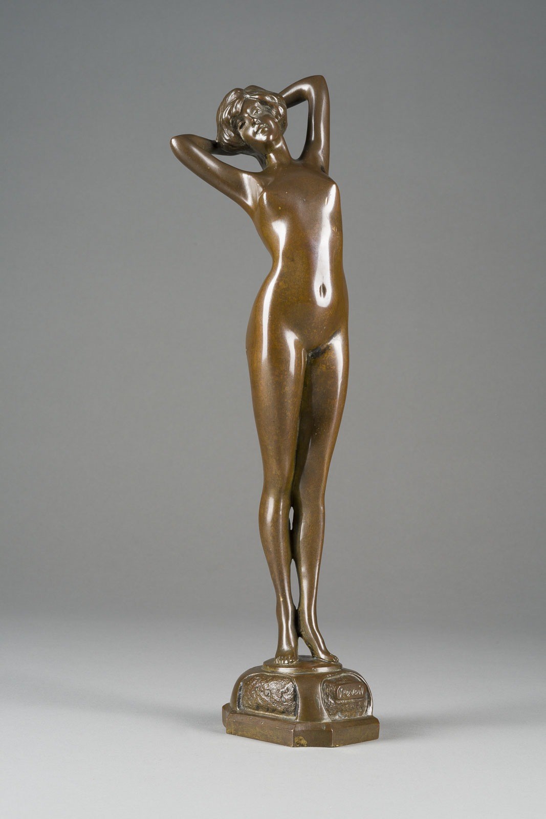 Bronze, braun patiniert. H. 40, B. 8, T. 9,5 cm, Gew. ca. 2,85kg. Auf der Plinthe bezeichnet 'Philipp', vorderseitig betitelt 'Reveil'. Part. Verlust der Patina und best.