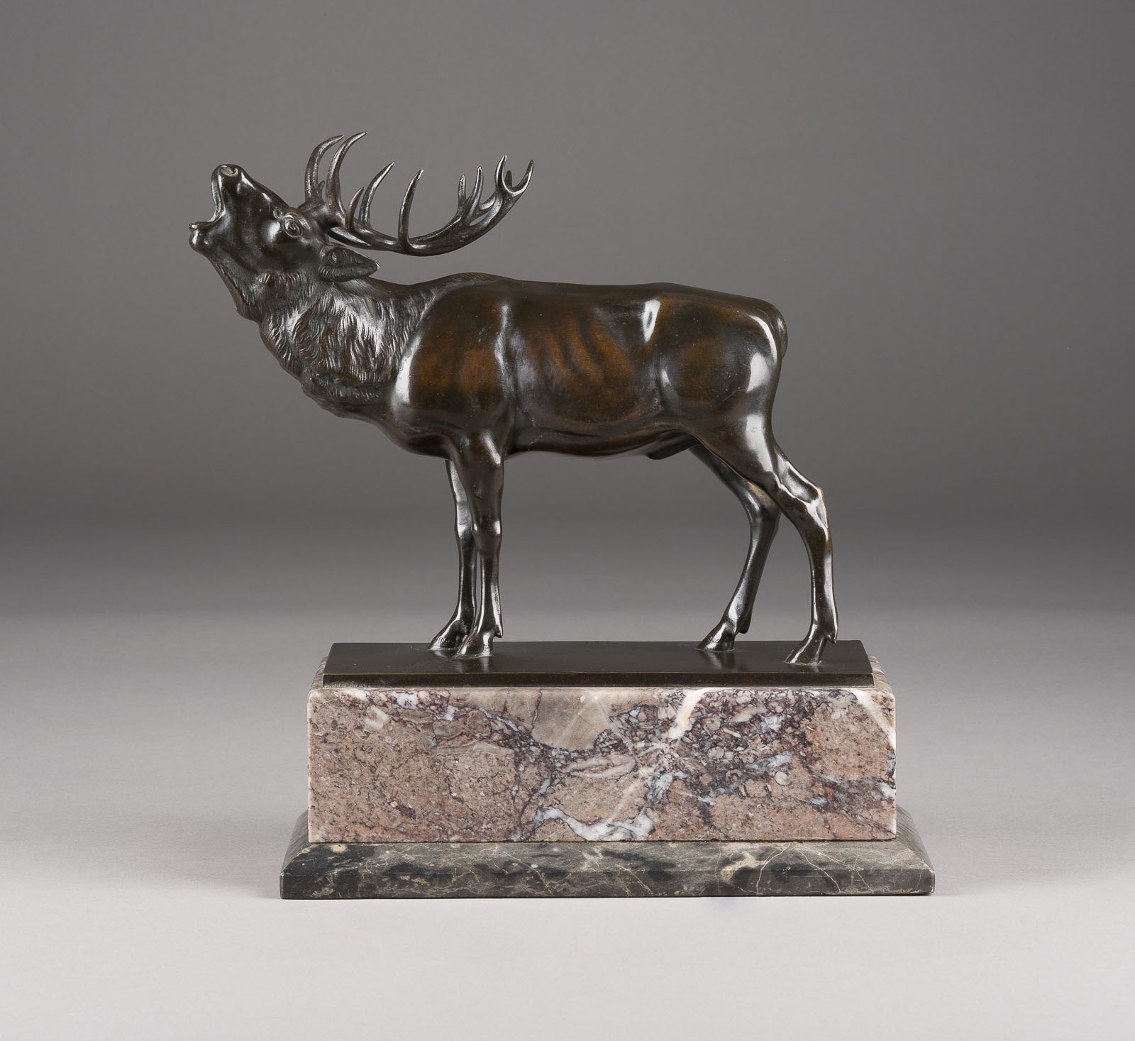 Bronze, dunkel patiniert, auf rechteckiger Plinthe und Marmorsockel (H. 8,5 cm). Ges.-H. 30, B. 29, T. 12,5 cm, Gew. ca. 8,12kg. Auf der Plinthe bezeichnet 'W. Robra'. Part. Verlust der Patina, Plinthe ber.