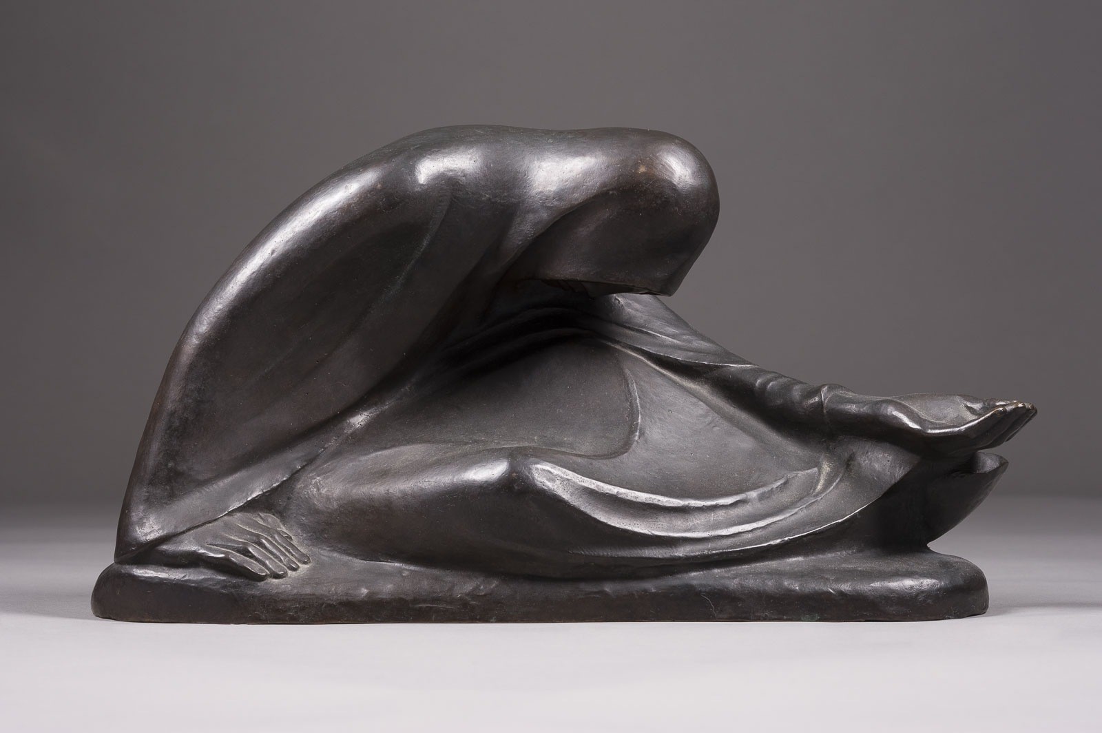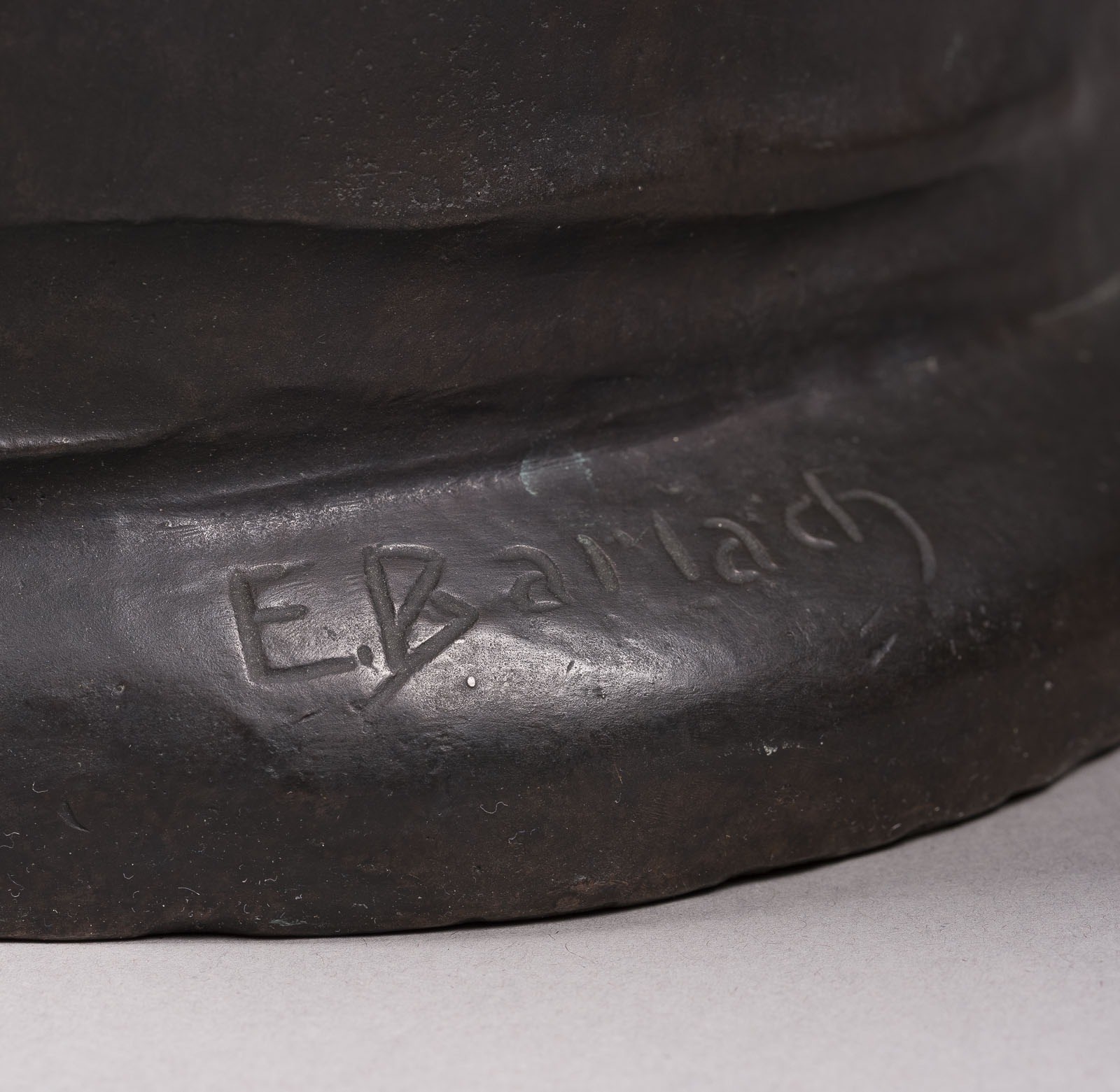 Bronze, dunkel patiniert. H. 23, B. 42, T. 17 cm, Gew. ca. 8,58kg. Rückseitig bezeichnet 'E. Barlach', posthumer Guss. Ausdrucksstarke Darstellung einer sitzenden Bettlerin, in einer in sich gekehrten Haltung,