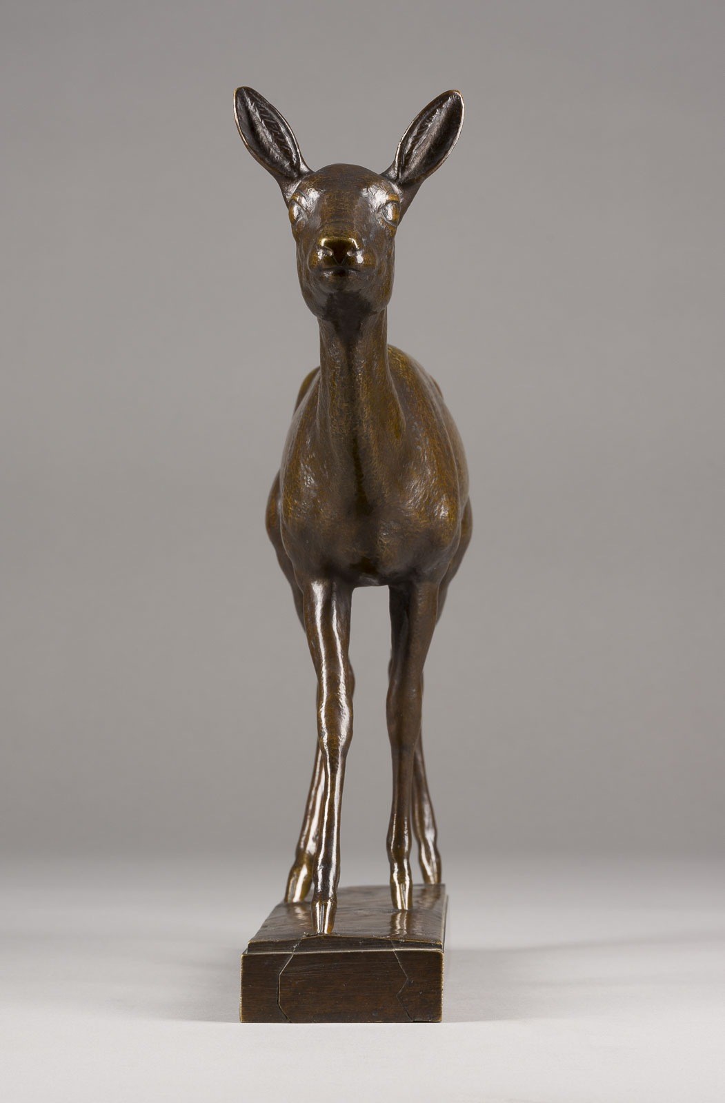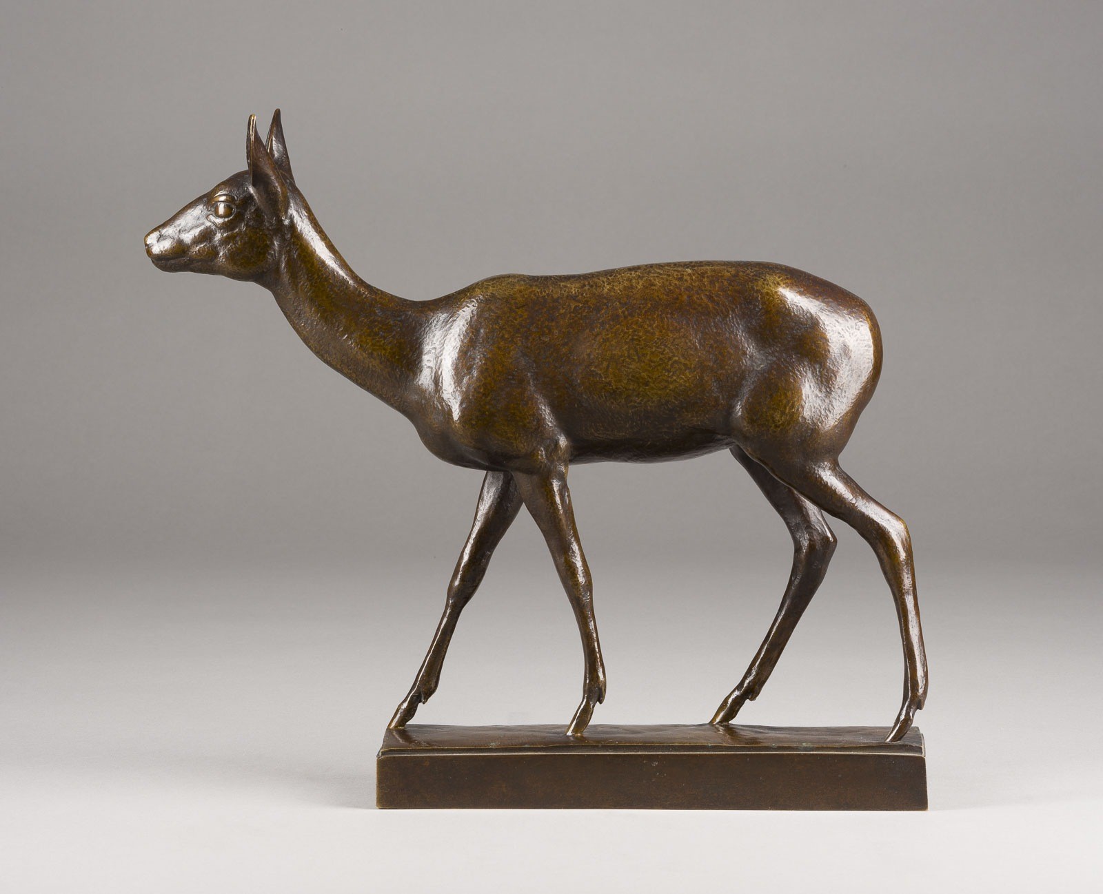 Bronze, dunkel und dunkelgrün patiniert, auf rechteckiger Plinthe und Marmorsockel (H. 3 cm). Ges.-H. 32, B. 36, T. 8 cm, Gew. ca. 6,31 kg. Auf der Plinthe signiert 'A. Gaul', seitlich am Sockel römisch nummeriert 'V'. Das "Schreitende Reh" von August Gaul ist eines der beiden Rehe, die der Tierbildhauer für