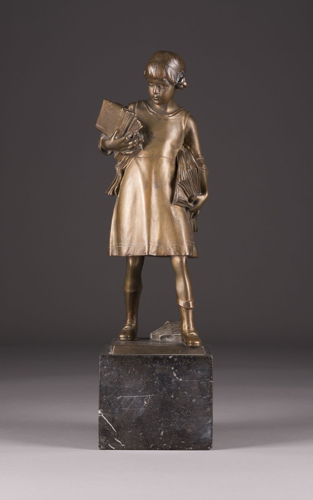 Bronze, dunkel patiniert, auf quadratischer Plinthe und Würfel-Marmorsockel (H. 10 cm). Ges.-H. 42,5, B. 12, T. 11,5 cm, Gew. ca. 16,87 kg. Rückseitig auf der Plinthe sig. 'Prof. V. H. Seifert'. Vollplastische Darstellung eines Mädchens, mit gesenktem Blick und mehrere Bücher tragend. Best., ber. und part. Verlust der Patina.