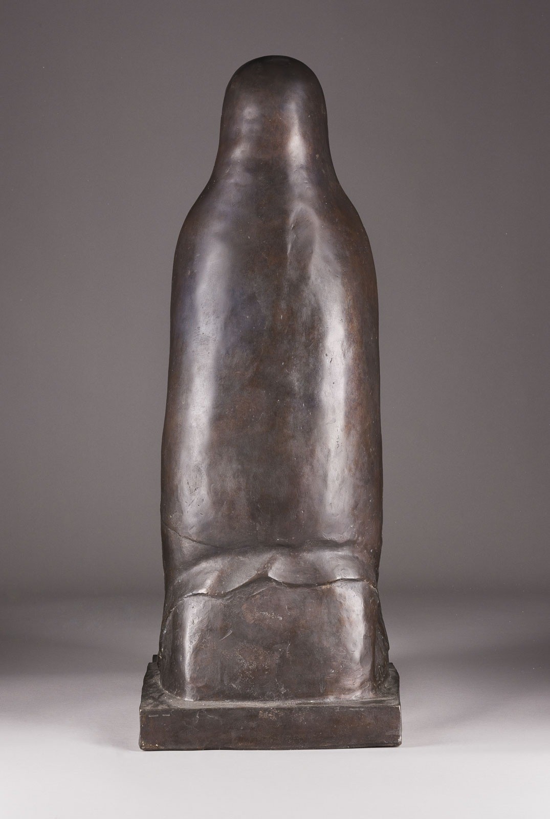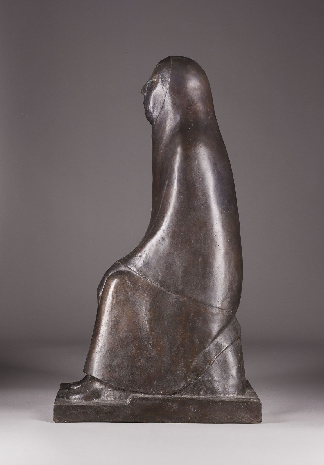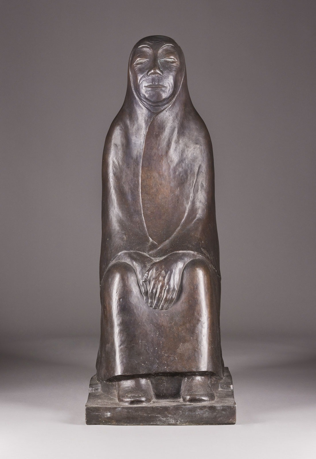 Bronze, dunkel patiniert, auf rechteckiger Plinthe. H. 82,3, B. 31, T. 43 cm. Seitlich bezeichnet 'E. Barlach', datiert '1933', rückseitig an der Plinthe Giessereimarke 'H. Noack Berlin', posthumer Guss. Ausdrucksstarke Figur der "Sitzenden Alten". Die in sich gekehrte, kompakt aufgebaute