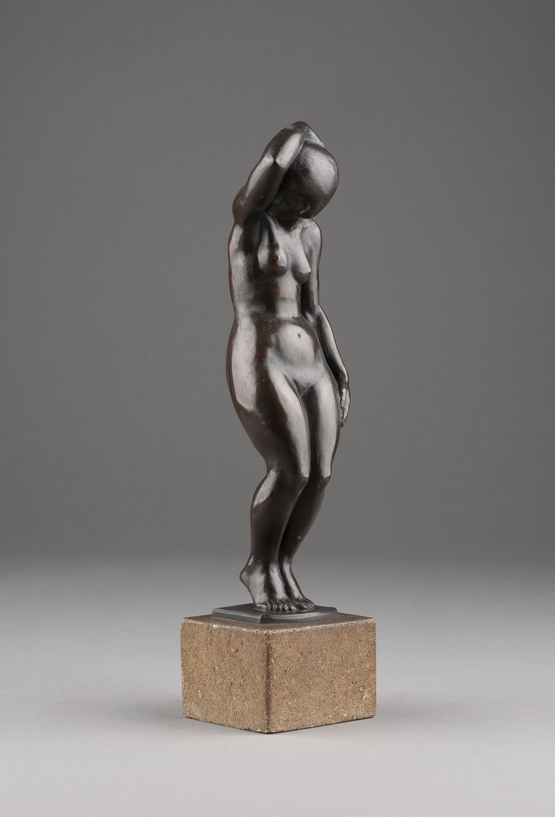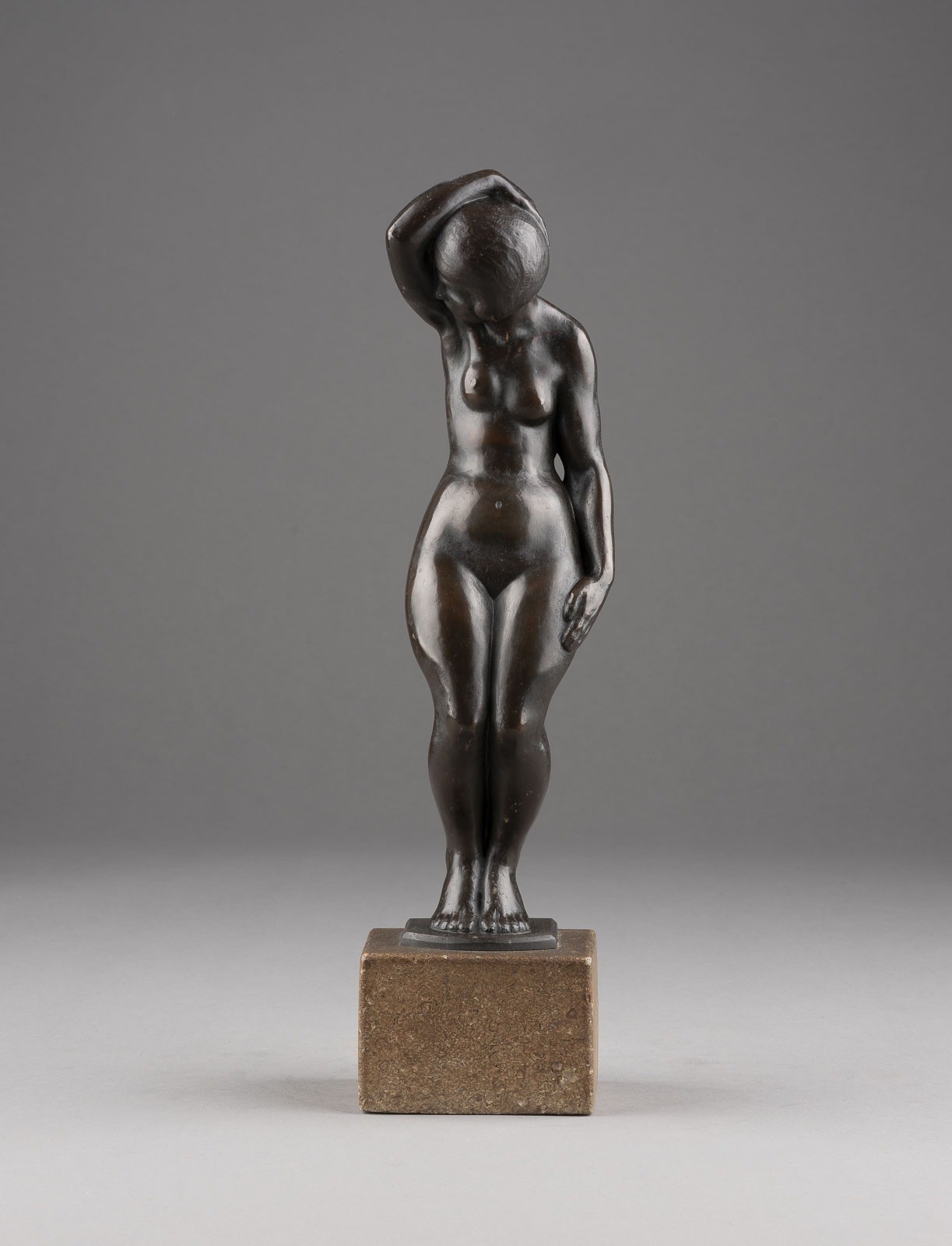 Bronze, dunkel patiniert, auf Plinthe und rechteckigem Steinsockel (H. 6 cm). Ges.-H. 37, B. 9, T. 8 cm, Gew. 3,56 kg. Auf der Plinthe signiert 'Hintzmann'. Min. ber. und Verlust der Patina, am Hals min. best..