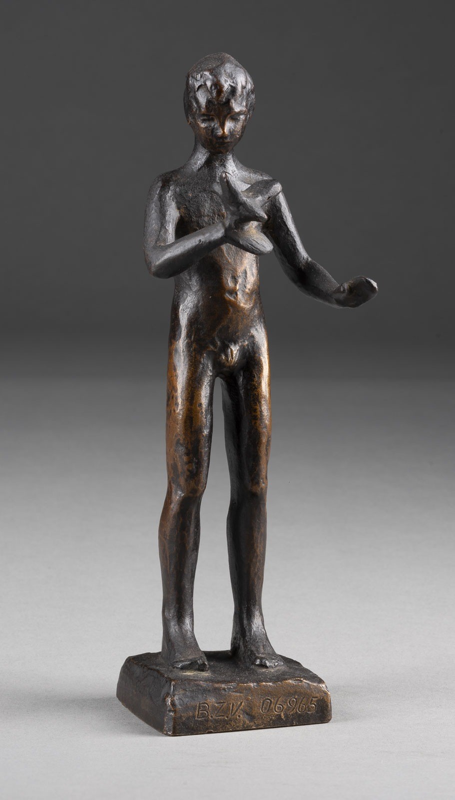 Bronze, schwarz patiniert, auf eckiger Plinthe. Ges.-H. 22,5, B. 6, T. 5,5 cm, Gew. ca. 1,1 kg. Vorne monogrammiert 'B.Z.V.', dat. '06965'. Verlust der Patina, min. ber..