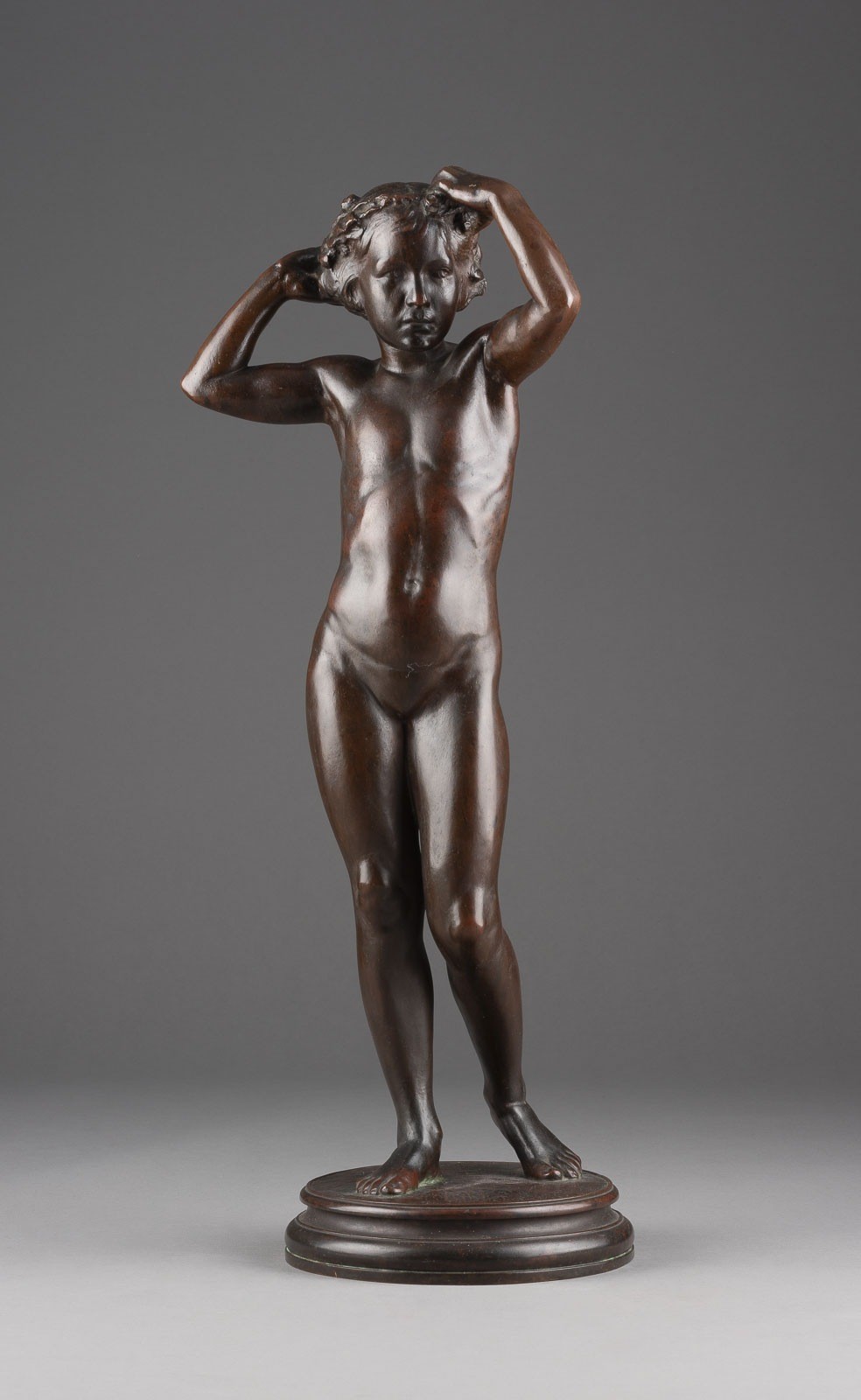 Bronze, dunkel patiniert, auf runder Plinthe (H. 4,5 cm). Ges.H. 63,5 , B. 25, T. 20 cm, Gew. ca. 7,76 kg. Auf der Plinthe signiert 'C. Siegel'. Part ber. Und Verlust der Patina, min. best..