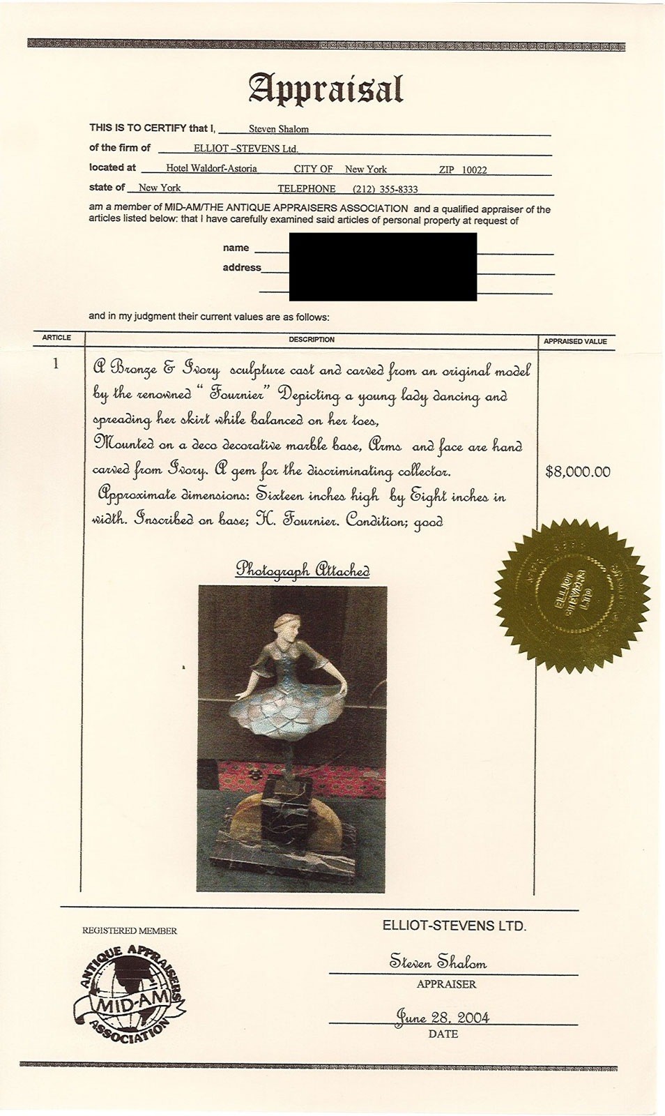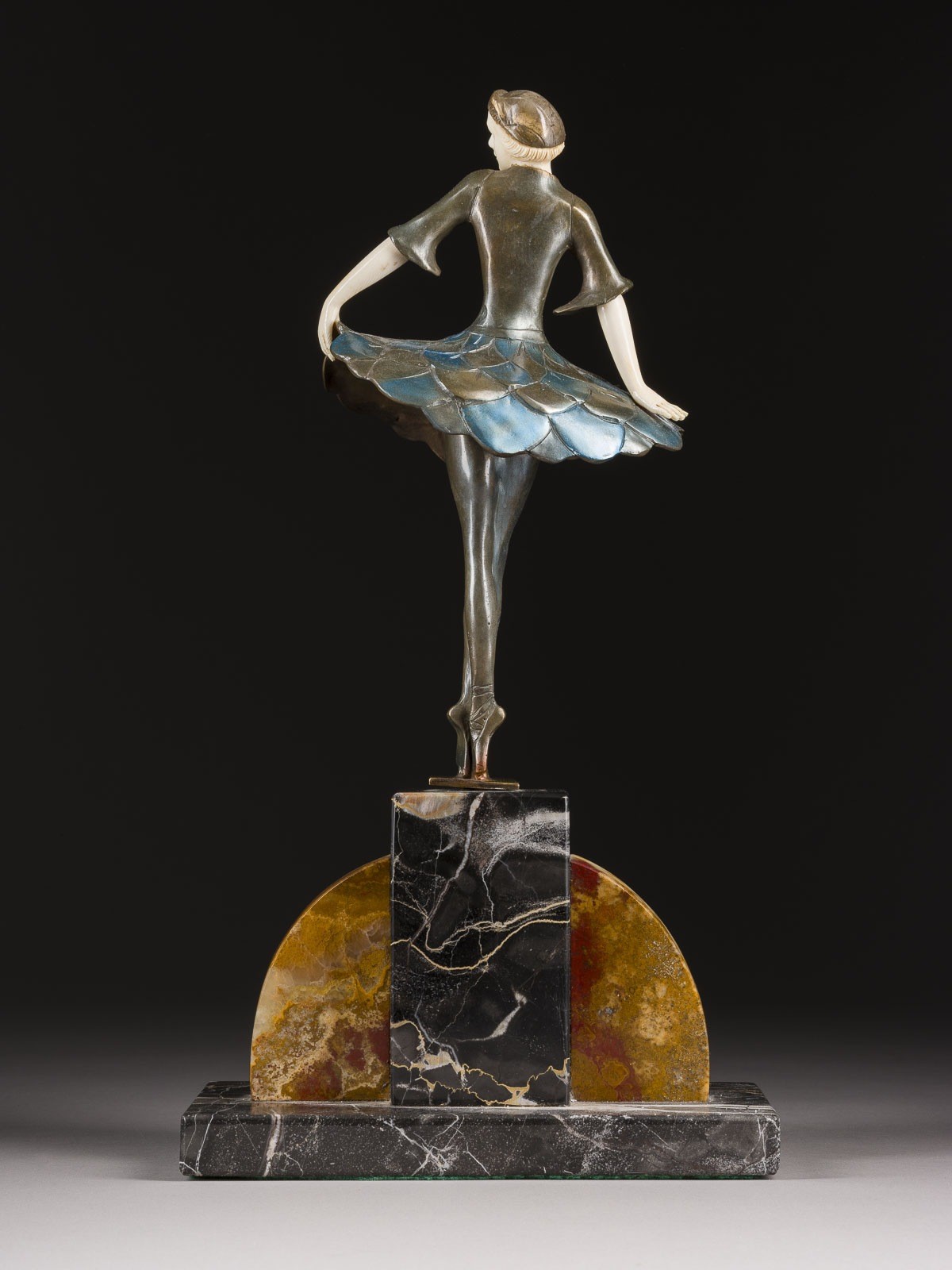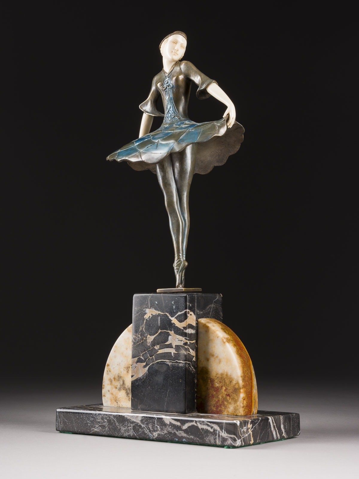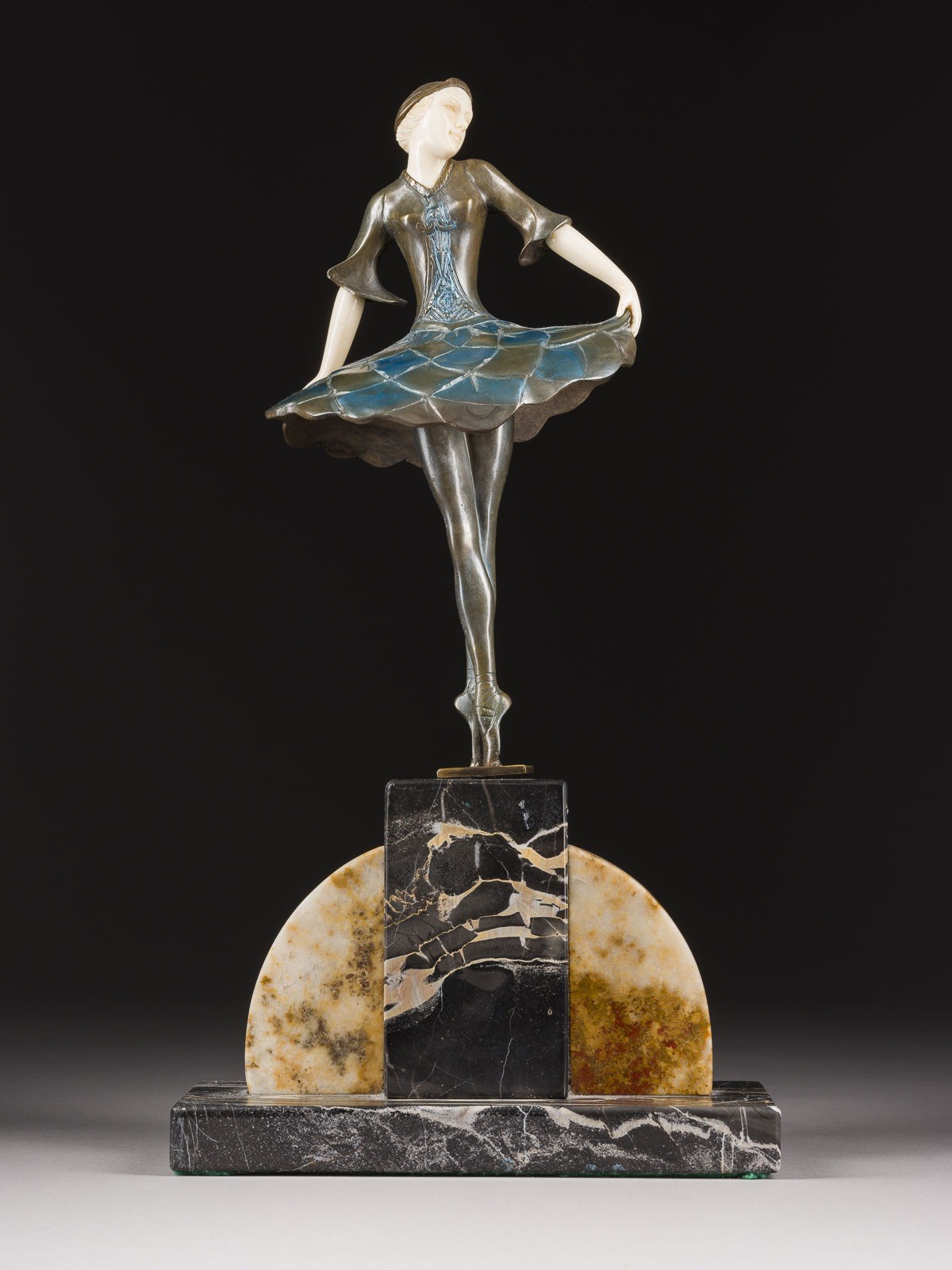 Bronze, dunkel und golden patiniert, fein ziseliert, Gesicht und Arme aus Elfenbein geschnitzt, auf einem Marmor-/Onyxsockel. H. 41,5, B. 22, T. 11,5 cm, Gew. ca. 4,92kg. Auf dem Sockel bez. 'H. Fournier', vermutlich Entwurf nach Johann Philipp Ferdinand Preiss (1882 Erbach - 1943 Berlin). Anmutige Bronzefigur einer tanzenden Ballerina, in schwungvoller Bewegung dargestellt, der
