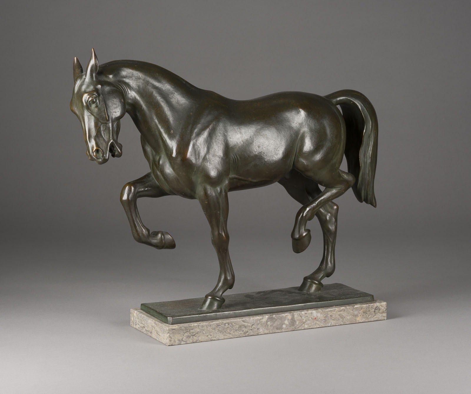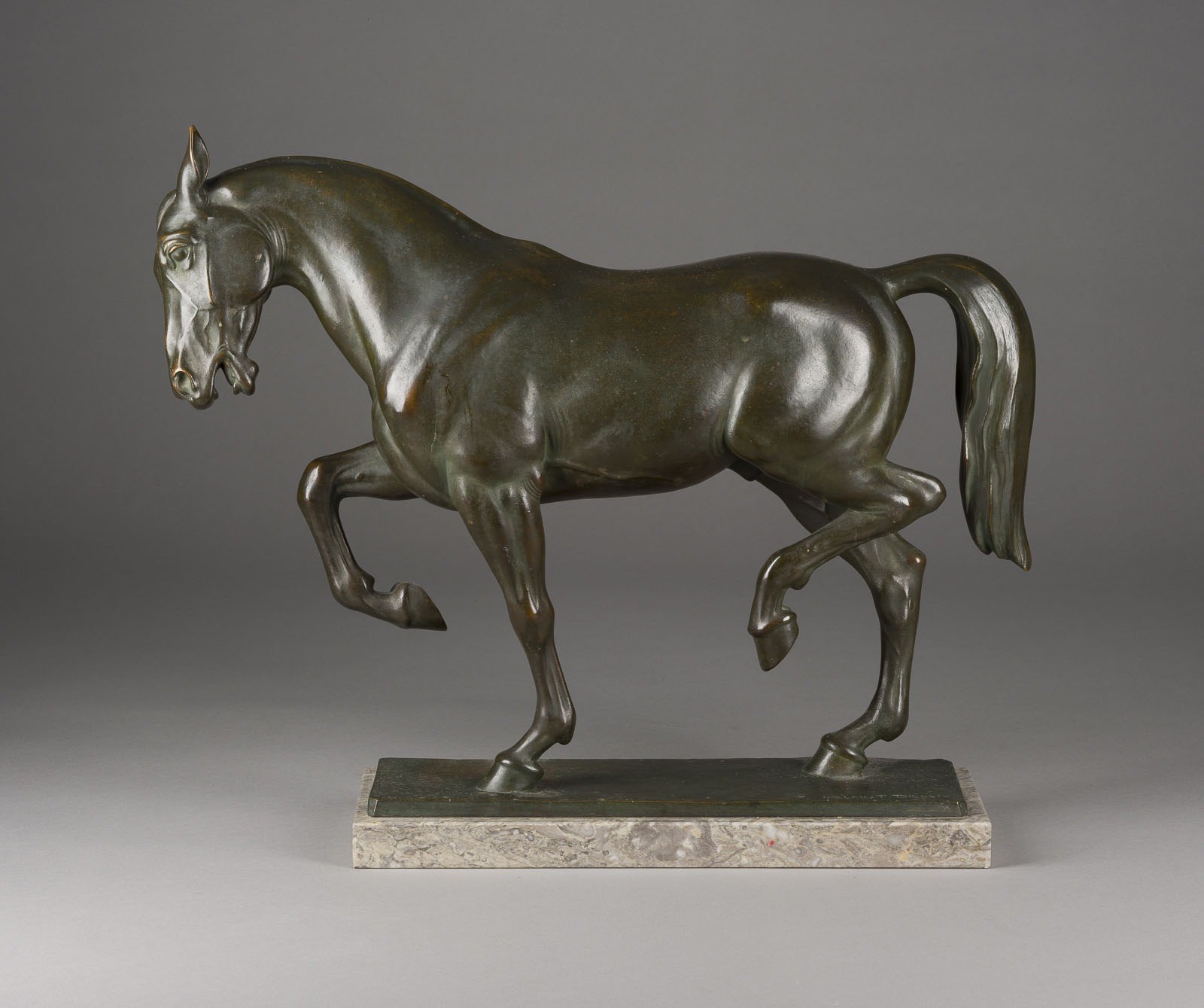 Bronze, dunkel patiniert, auf rechteckiger Plinthe und Marmorsockel (H. 3 cm). Ges.-H. 45, B. 53, T. 15 cm, Gew. ca. 15kg. Auf der Plinthe signiert 'Helmut Diller' und datiert '48'. Part. best. und ber.