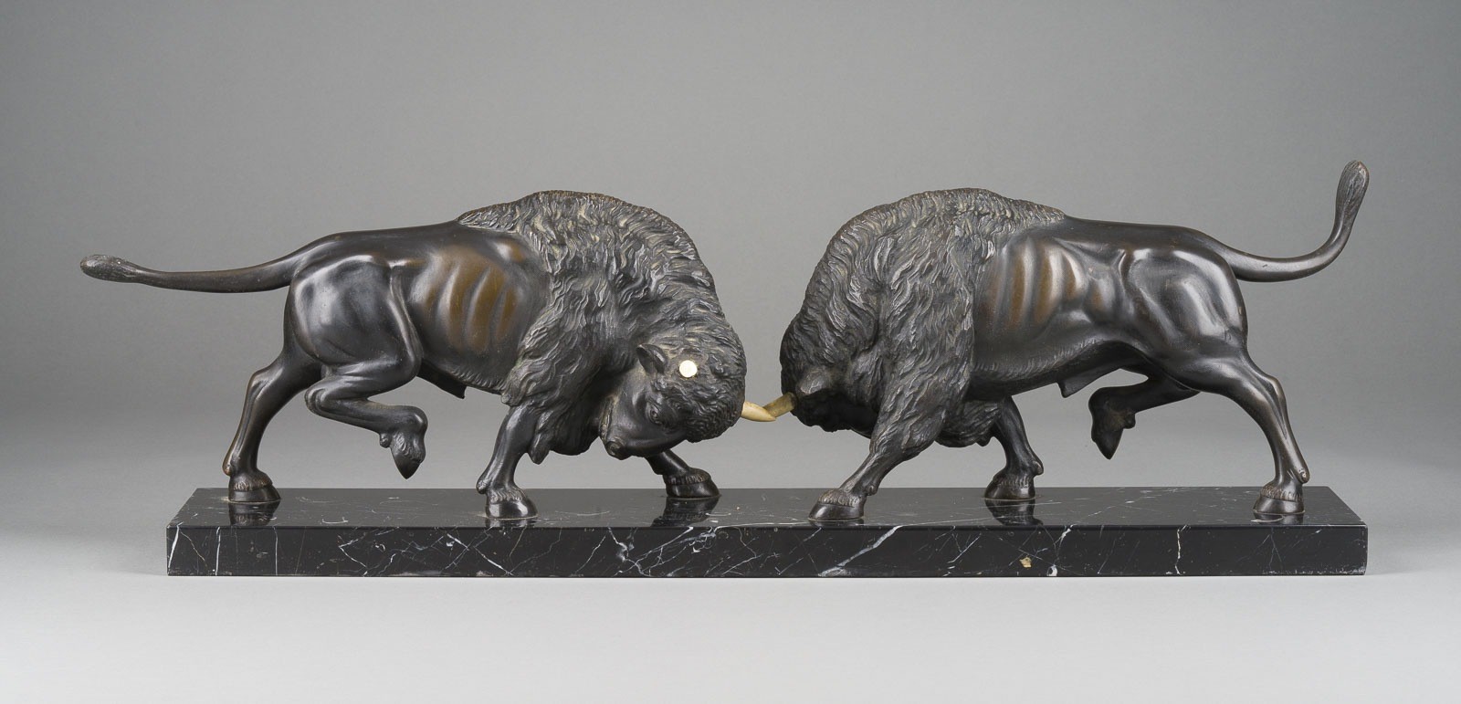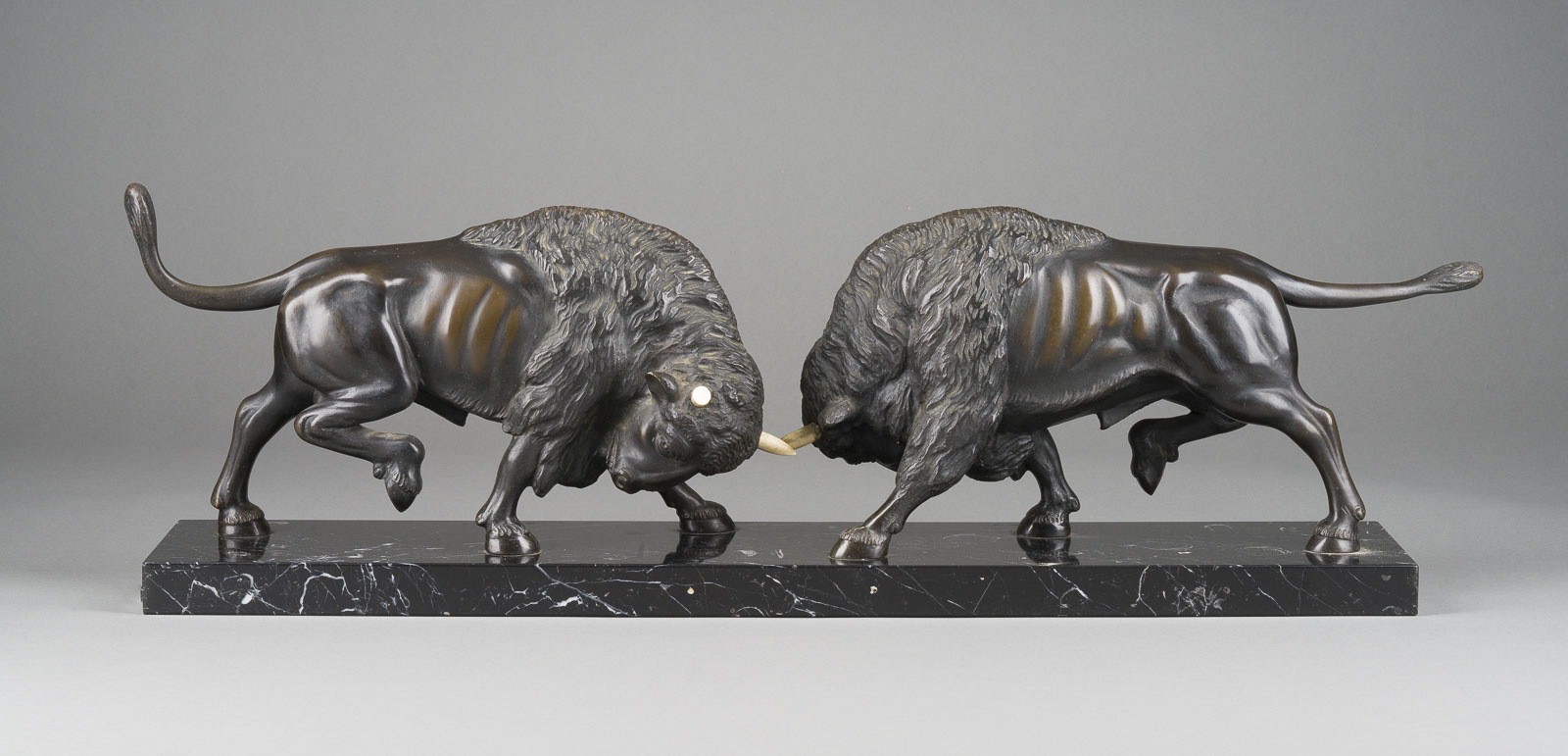 Bronze, dunkel patiniert, Hörner aus Knochen, auf rechteckigem Marmorsockel (H. 3,5 cm). Ges.-H. 21, L. 76, T. 15 cm. Unsigniert.