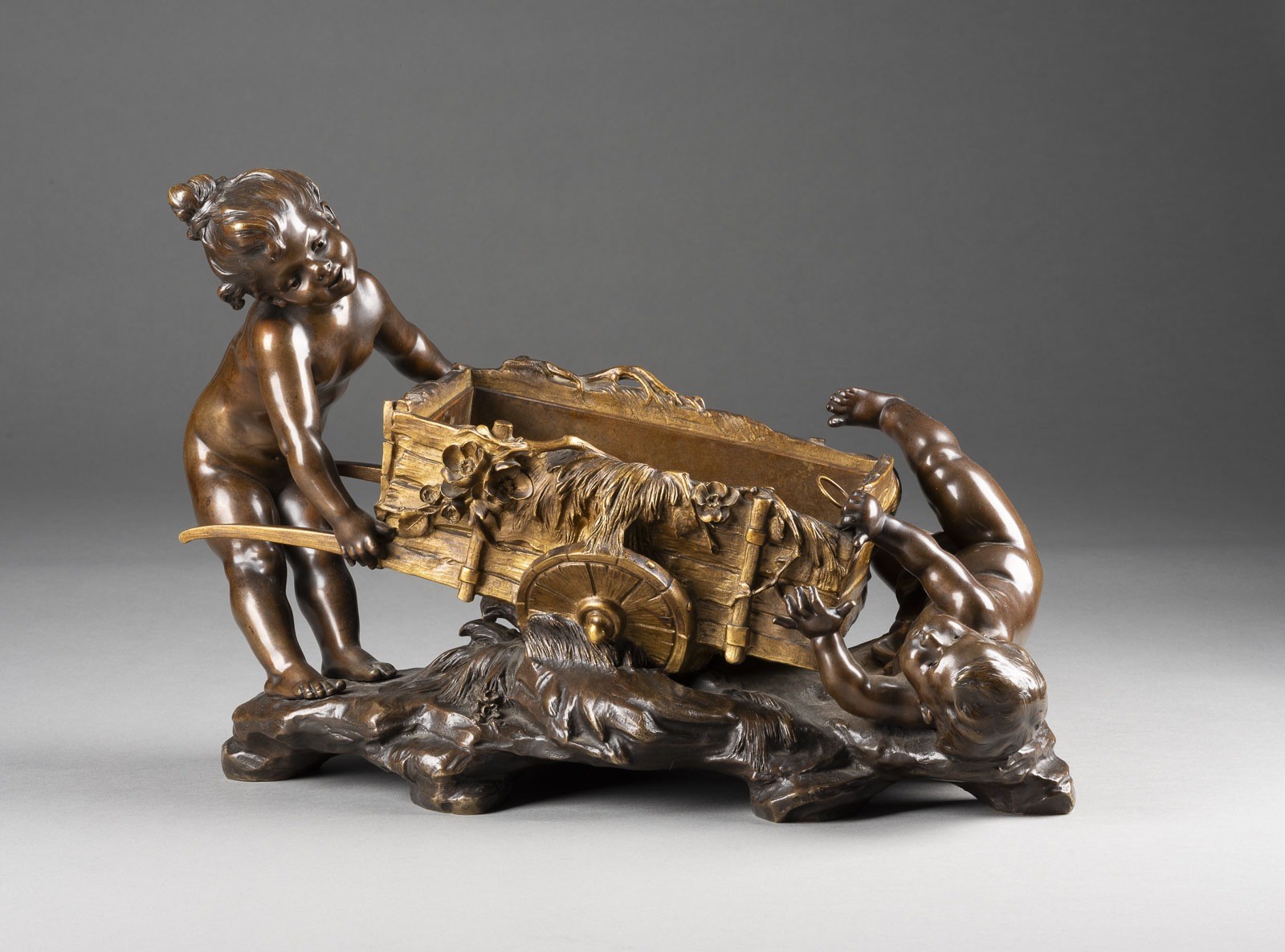 Bronze, braun patiniert, auf naturalistischer Plinthe. Ges.-H. 28,5, B. 41, T. 17,5 cm, Gew. ca. 12,31 kg. Seitlich sig. 'Aug. Moreau'. Min. ber. und Verlust der Patina.