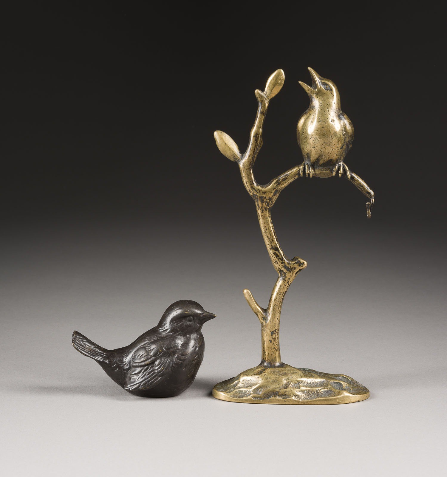 Bronze, dunkel und golden patiniert. H. 22/7 cm, Gew. ca. 0,28/0,63kg. Auf dem Ast monogrammiert 'R.P.' und unsigniert. Part Verlust der Patina und ber.