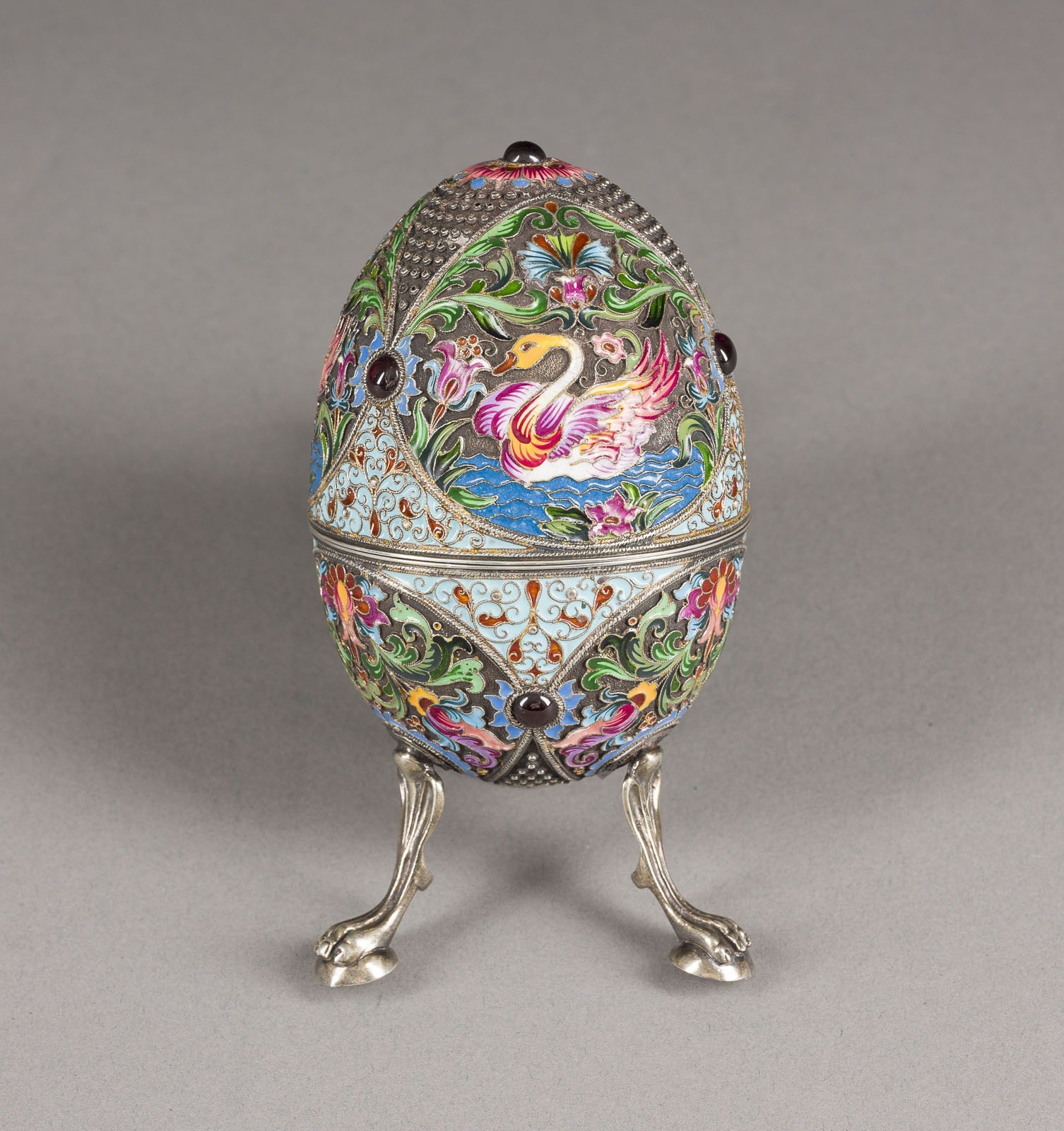 Silber, innen vergoldet, Email, Cabochon-Besatz. H. 12,3 cm. Pseudo-russische Marken. Ein Bein gebrochen.