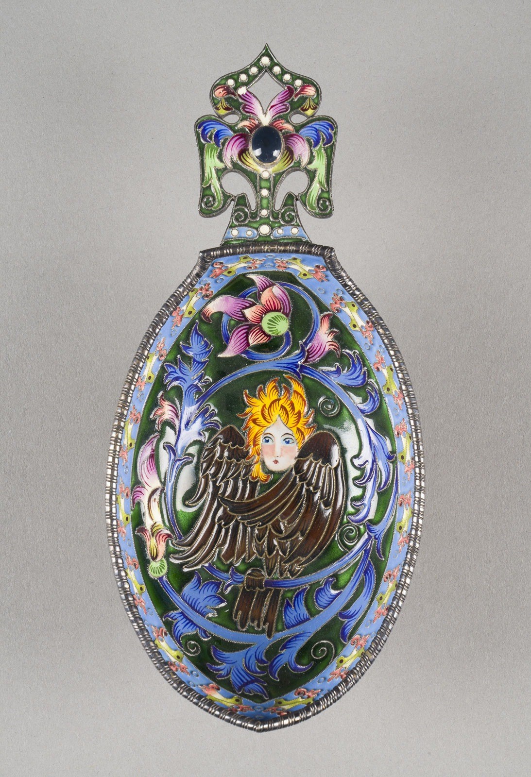 Silber, vergoldet, schattiertes Cloisonné-Email, roter Cabochon. L. 19,4 cm, 268 g. Pseudo-russische Marken.