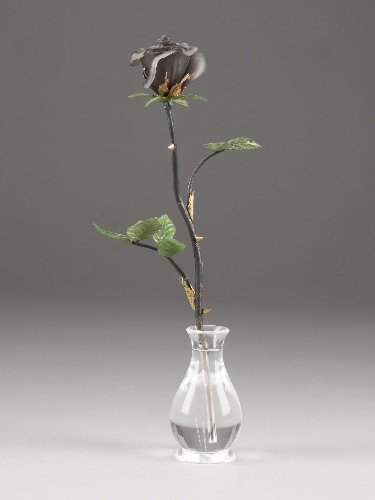 Weißgold, Gelbgold, Nephrit, Bergkristall und Achat. H. 27 cm. Punziert mit Feingehalt '585' sowie Herstellermarke. Ein Blatt fehlt.