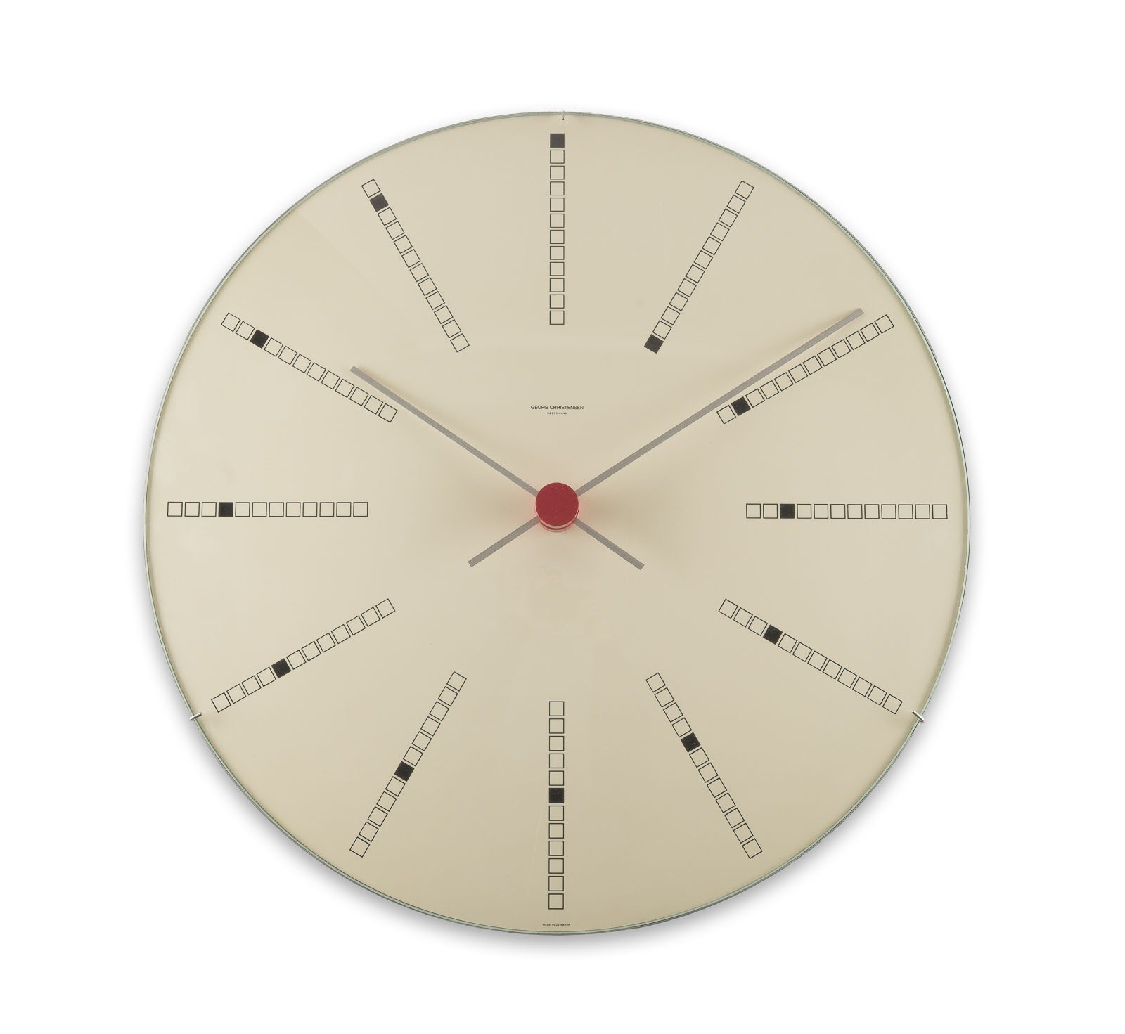 Aluminium eloxiert, Glas farblos, Quartzwerk (Junghans). H. 7 cm, D. 48 cm. Bez. 'GEORG CHRISTENSEN KOBENHAVN' u. 'MADE IN DENMARK' (gedruckt). Sehr leichte Gebrauchsspuren.