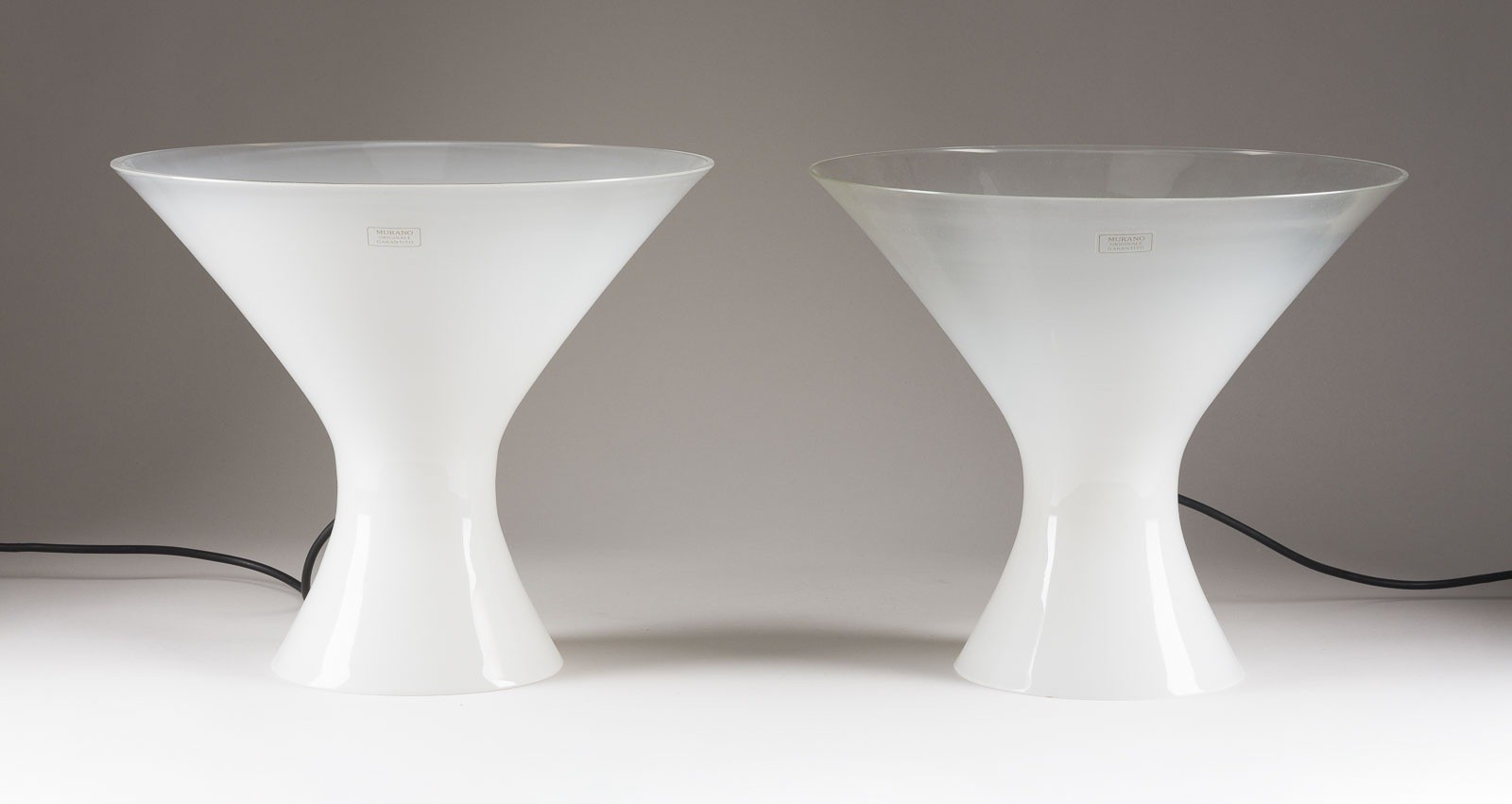 Muranoglas 'a sfumato' weiß u. farblos, jew. 1-flg. elektrifiziert, m. Dimmertrafo. H. 28,5 cm, D. max. 33,5 cm. Etikett 'MURANO ORIGINALE GARANTITO'. Minimale Gebrauchsspuren, ein Dimmertrafo o. Funktion.
