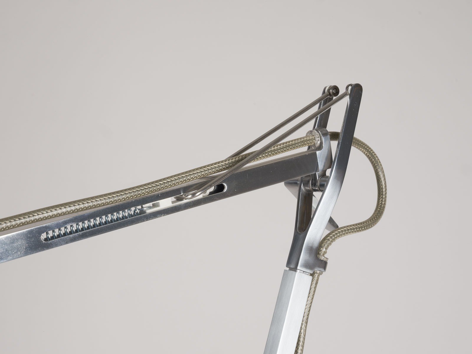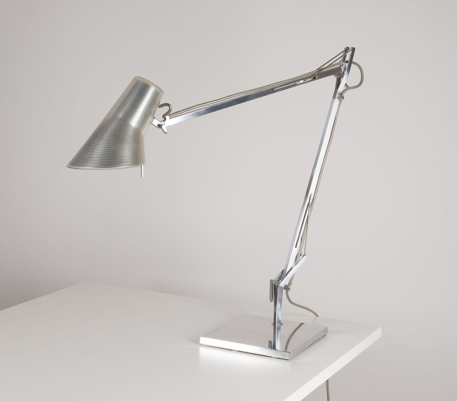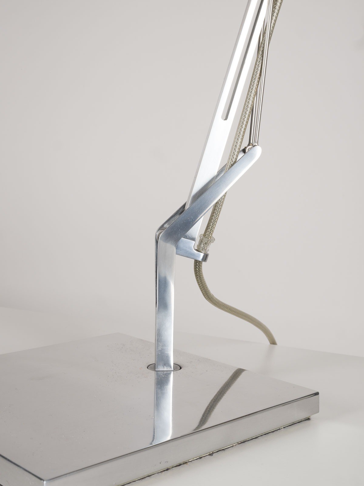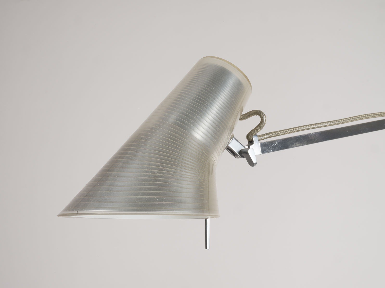 Zamak u. Aluminium eloxiert, Kunststoff, 1-flg. elektrifiziert. H. ca. 95 cm, Sockel: L. 20 cm, B. 20 cm. Bez. 'FLOS Kelvin T adjustable' (Etikett). Leichte Gebrauchsspuren.