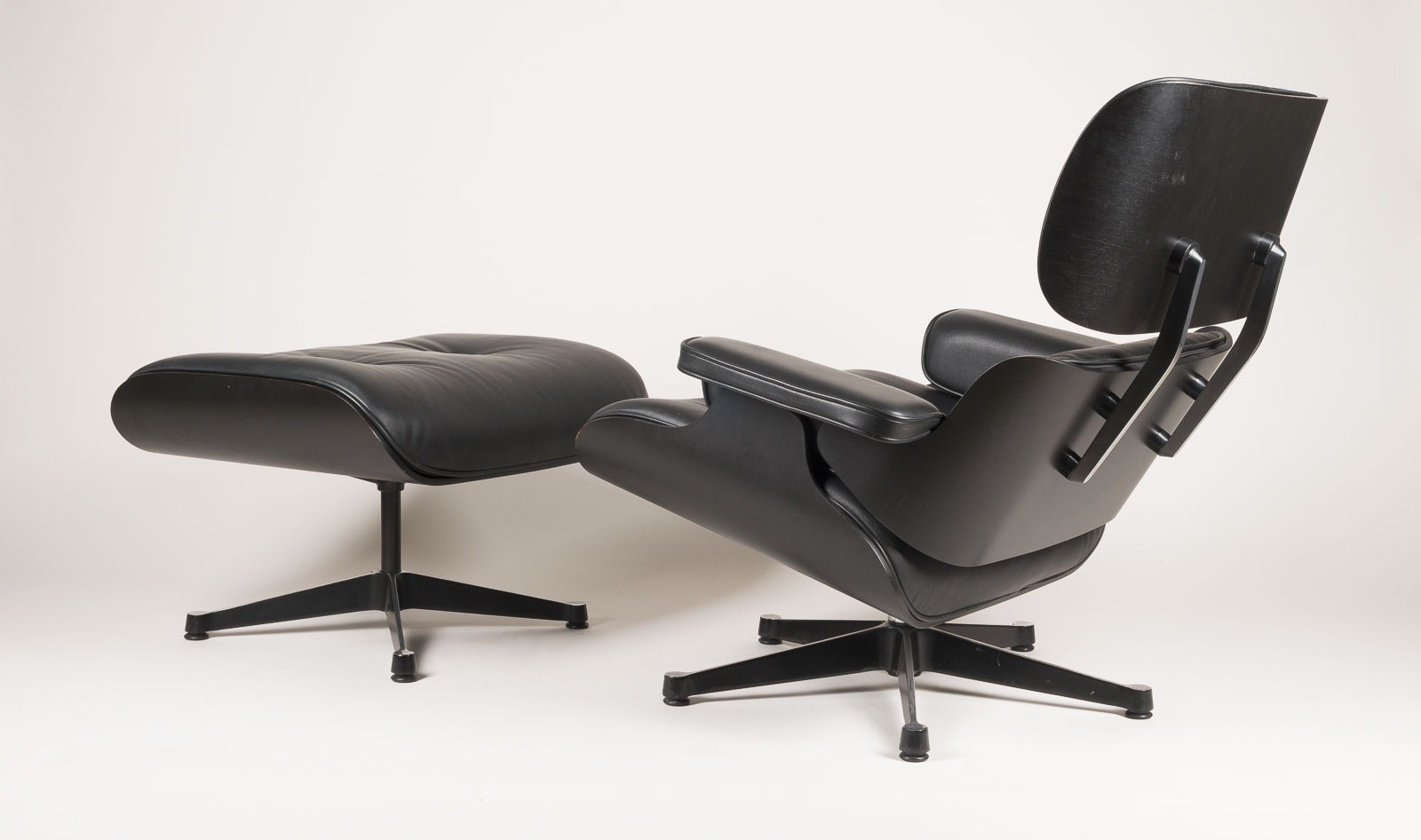 Schichtholzschalen, schwarz lackiert, Polsterkissen, schwarzer Lederbezug, Aluminiumguss schwarz lackiert. H. 83 cm, B. ca. 85 cm, T. 85 cm (Sessel), H. 43 c. Jew. unterseitig bez. 'Original Eames Lounge Chair Charles Eames Vitra' (Etikett). Sehr leichte Gebrauchsspuren.
