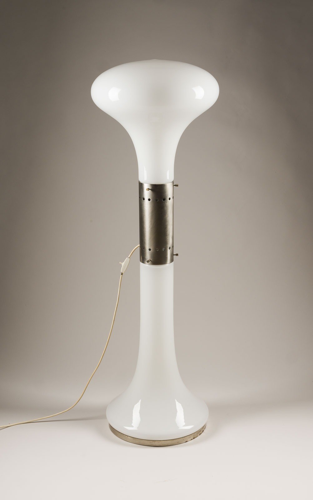 Metall vernickelt, Glas, weiß, mundgeblasen, 2-flg. elektrifiziert. H. 120 cm, D. 40 cm. Gebrauchsspuren, Stand teilw. rostig, unteres Glas min. best..