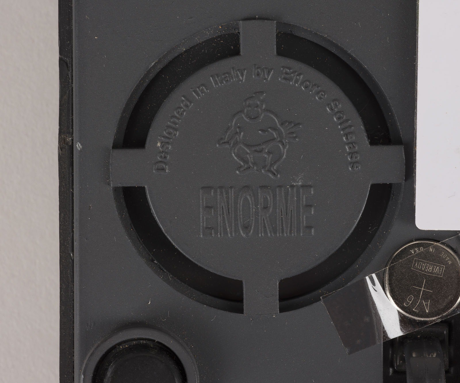 Mehrfarbiger Kunststoff, Funktion ungeprüft. H. 6 cm, B. 19,5 cm, T. 10 cm (Gehäuse). Unterseitig bez. 'designed in Italy by Ettore Sottsass' u. 'Enorme'. Sehr leichte Gebrauchsspuren.