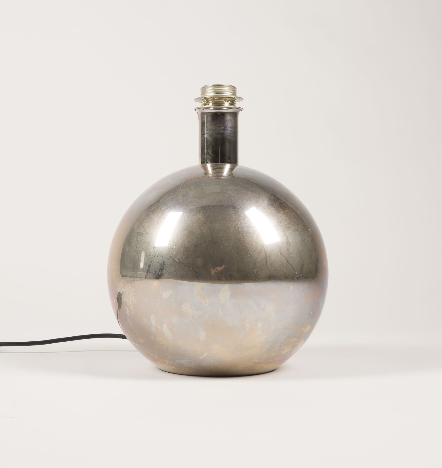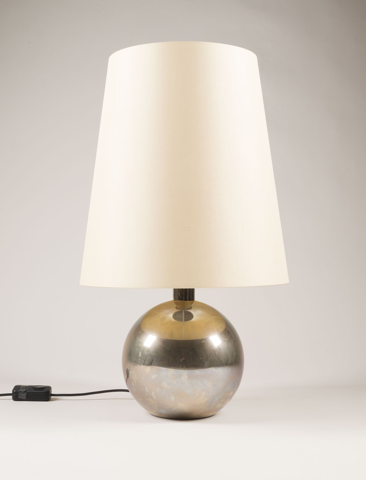 Messing vernickelt, Lampenschirm, Seidenbezug, 1-flg. elektrifiziert, m. Dimmer. H. 72 cm, Fuß: D. 25 cm. Unterseitig bez. (Herstelleretikett). Leichte Gebrauchsspuren.