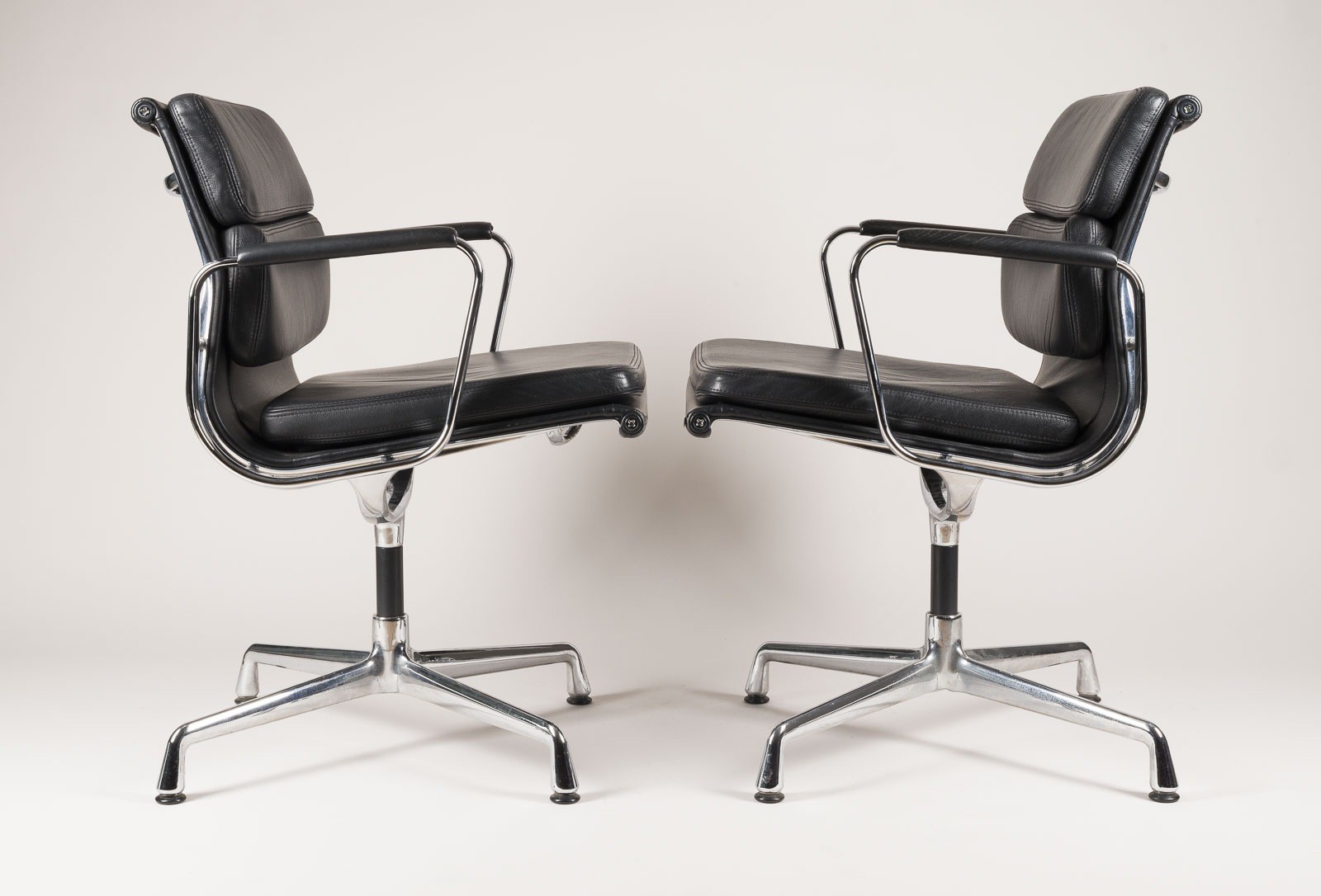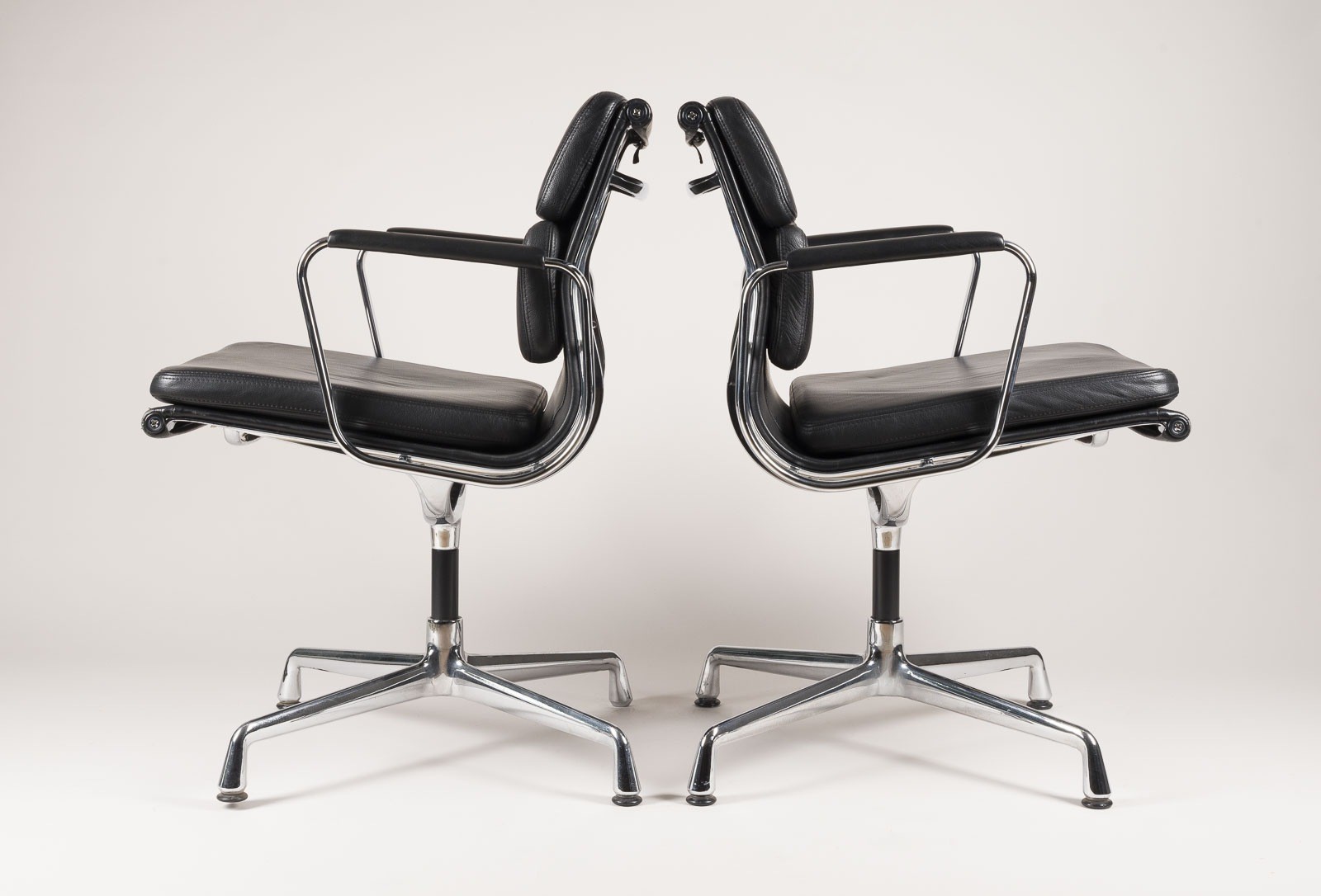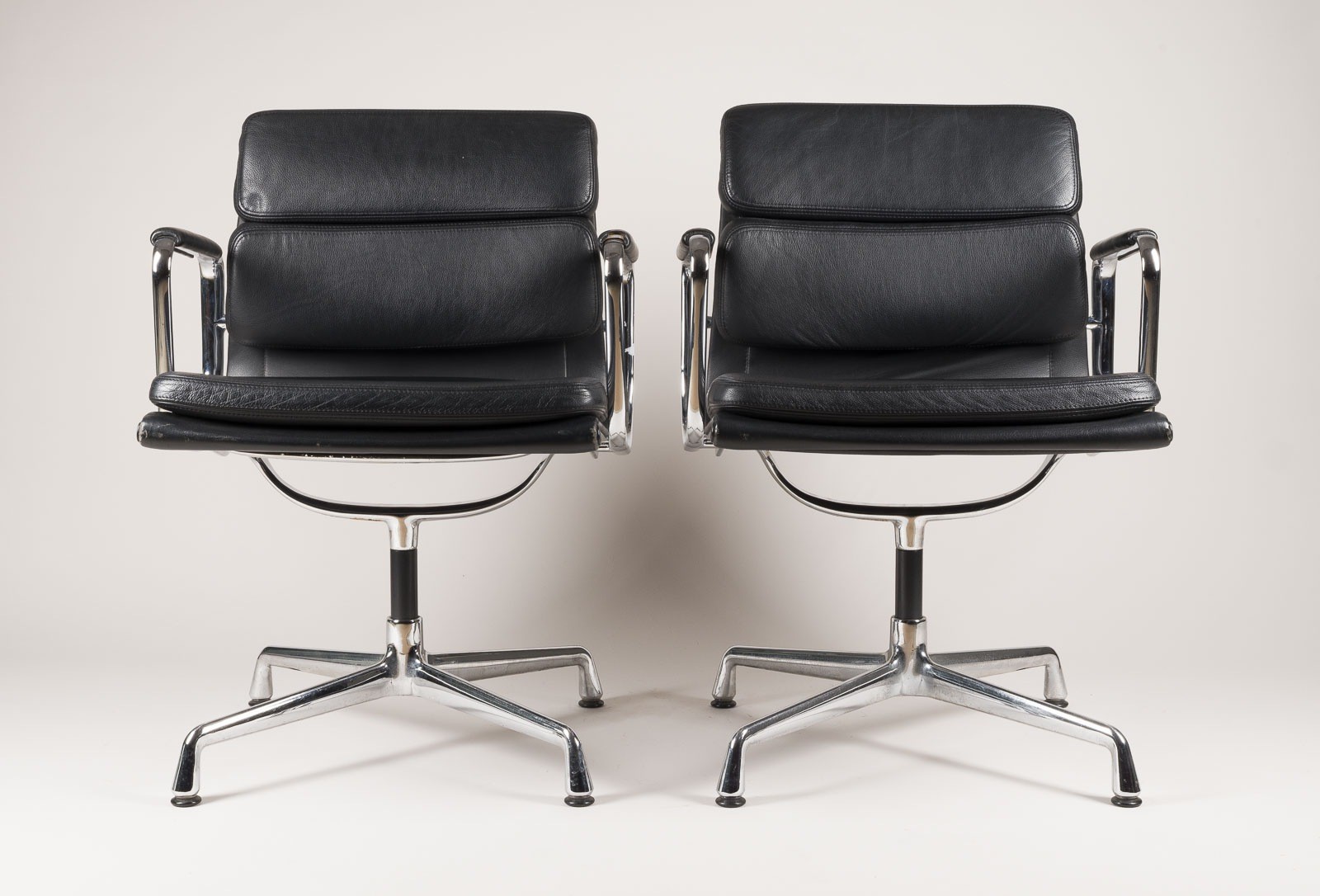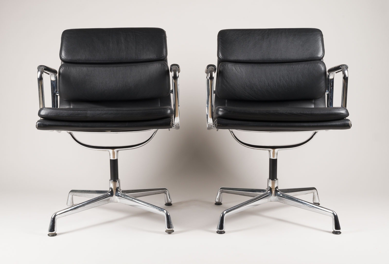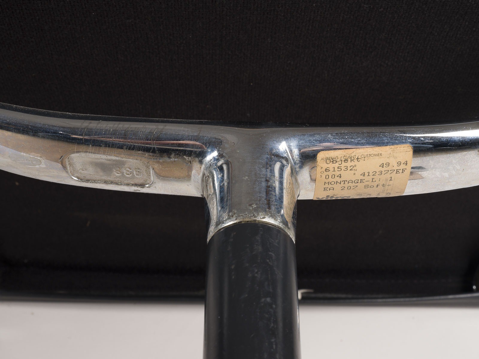 Aluminium verchromt, Lederbezüge schwarz, Details Kunststoff, jew. nicht drehbarer, vier-strahliger Fuß m. Gleitern. H. 85 cm, B. 60 cm, T. 56 cm. Bez. 'Charles Eames - The authorized original. Vitra' (Fahne). Ausgestattet mit Armlehnen.