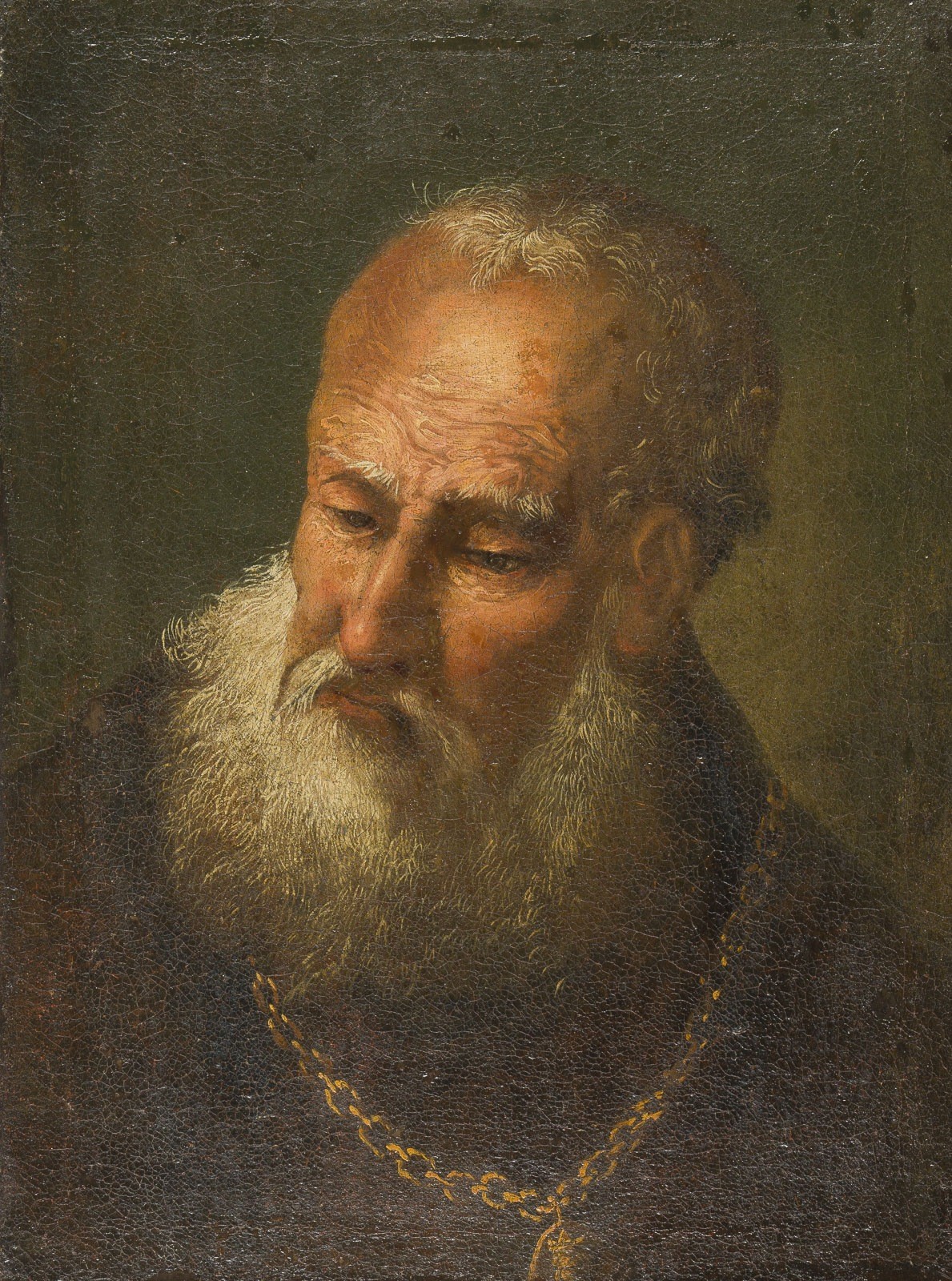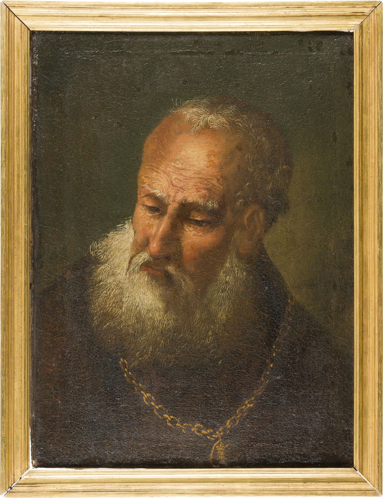 ITALIAN SCHOOL, AROUND 1700 PORTRAIT OF A GENTLEMAN WITH NECKLACE AND AMULET Oil on canvas (relined). 58 x 43 cm (F. 66 x 50 cm). Part. old rest., min. old retouching, extensive old craquelure. Frame. Provenance: South German private collection.
