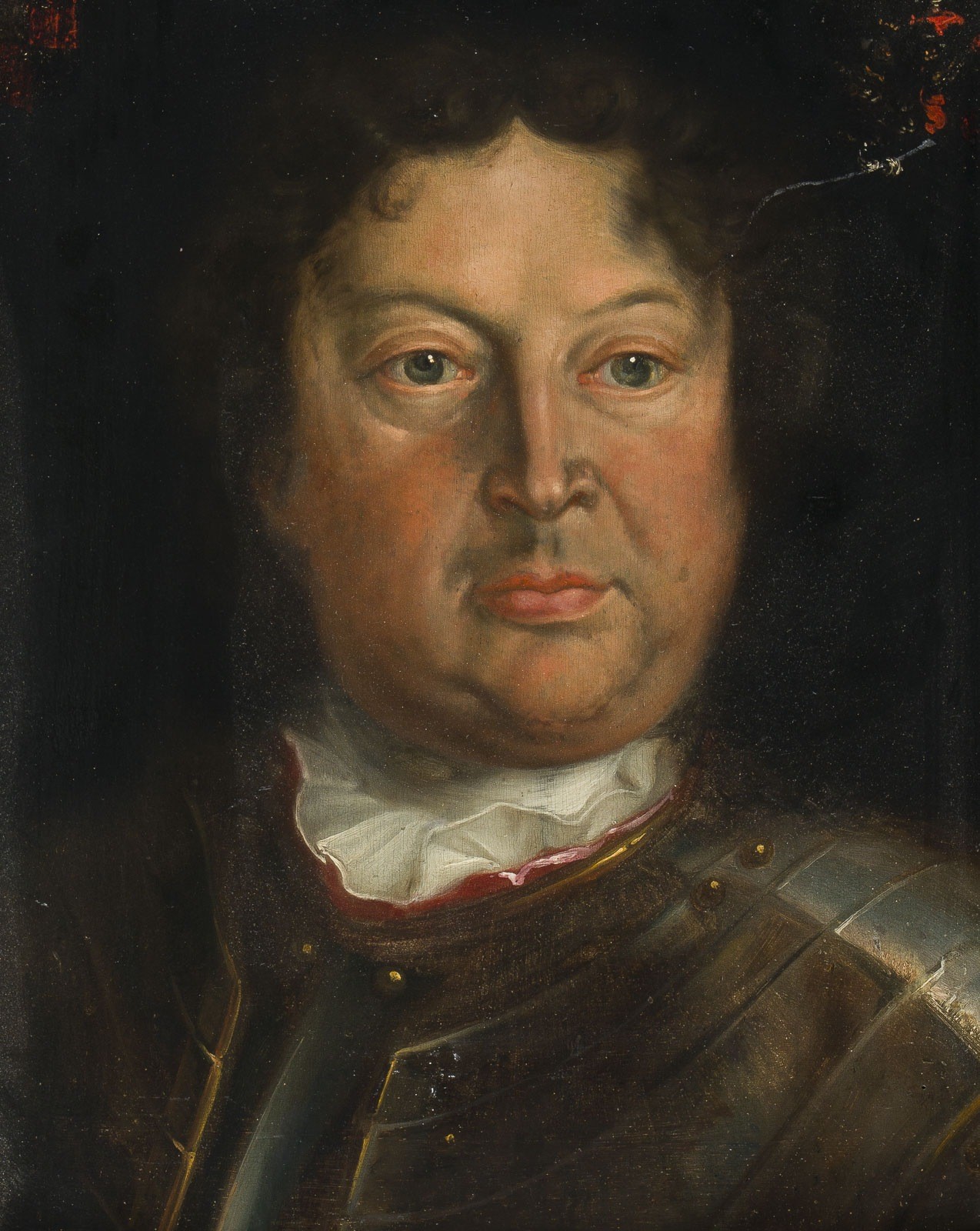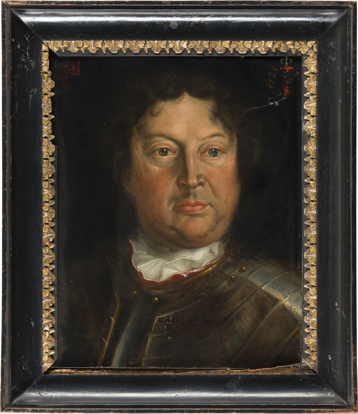 SOUTH GERMAN SCHOOL, AROUND 1700 BUST-LENGTH PORTRAIT OF A NOBLEMAN IN ARMOUR Oil on panel. 41 x 32 cm (F. 51.5 x 44.5 cm). Min. old rest., part. min. old retouching, upper left corner with coat of arms rubbed, min. scratch. Frame. Provenance: Private collection, Berlin.