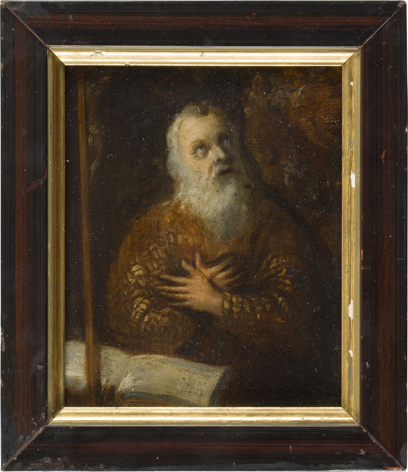 FLEMISH SCHOOL, AROUND 1700 THE PENITENT HERMIT Oil on copper plate. 15 x 12.5 cm (F. 19 x 16 cm). Min. old rest., old retouching. Frame. Provenance: South German private collection.