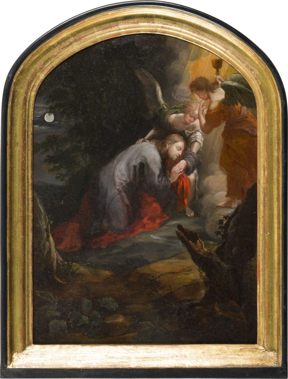 ITALIAN SCHOOL 17TH CENTURY CHRIST ON THE MOUNT OF OLIVES Oil on copper plate. 45 x 32 cm (F. 53 x 40 cm). Min. old rest., old retouching, loss of colour. Frame. Provenance: Private collection, North Rhine-Westphalia.