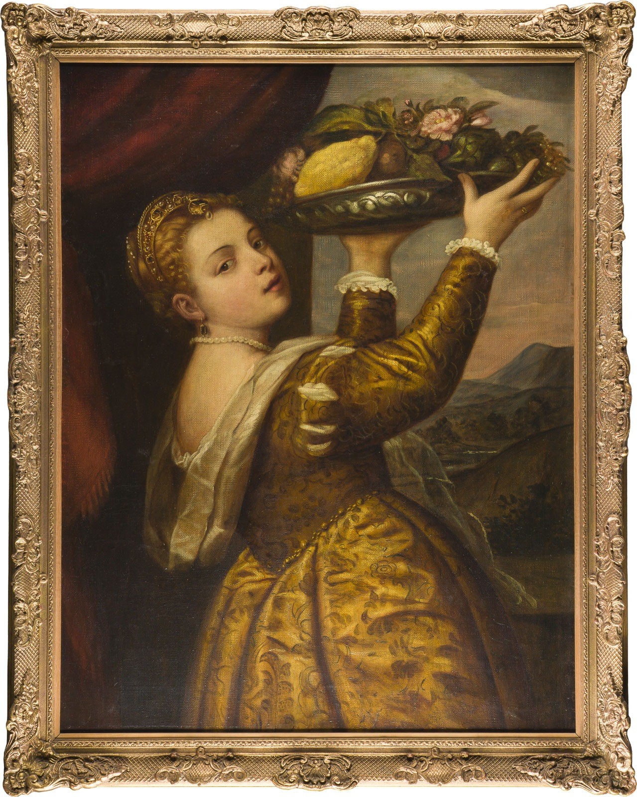 FOLLOWER OF TIZIANO (ACTUALLY: TIZIANO VECELLIO) OF THE 19TH CENTURY Around 1488 Pieve di Cadore - 1576 Venice THE GIRL WITH THE FRUIT BOWL Oil on canvas. 111 x 85 cm (F. 126 x 99 cm). Min: surface soiling. Frame. Provenance: Private collection, Rhineland.